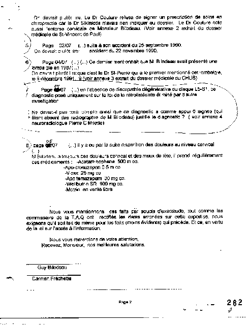 Il s’agit de : o La preuve que le Dr Sykiniotis avait référé monsieur Bilodeau au chiropraticien Denis Lebreux (voir à la page 15 du dossier médical) o Le diagnostic d’entorse cervicale du Dr Couture et son refus de faire un papier pour justifier les rendez-vous avec le chiropraticien. (voir aux pages 16 et 17 dossier médical) o Le rapport médical du docteur Michel St-Pierre, daté du 9 décembre 1991 ( voir aux pages 51 et 52 du dossier médical ) o L’expertise du docteur Pierre C. Millette, qui infime objectivement la discopathie dégénérative avec rétrolisthésis. ( voir aux pages 289 et 290 du dossier médical ) o La liste des frais reliés aux traitements de chiropractie, La preuve du paiement par la Société de l'assurance automobile du Québec des frais de déplacement reliés aux traitements de chiropractie (voir page 31 à 33C) |