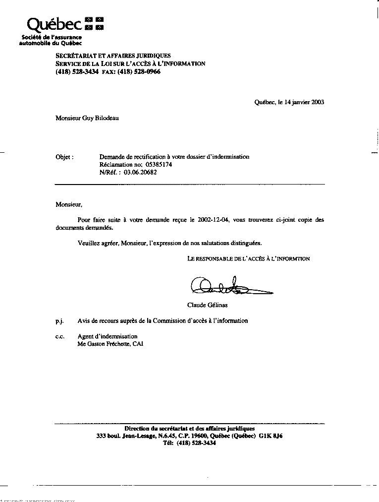 (reçu le 25 novembre 2002) monsieur Gélinas envoie sa réponse négative à la demande de rectification à l'expertise du docteur Girard. Il joint la réponse du docteur Girard à sa lettre ainsi que l'avis pour demander une révision à l'accès à l'information. Cette réponse est à 67 jours de la demande initiale