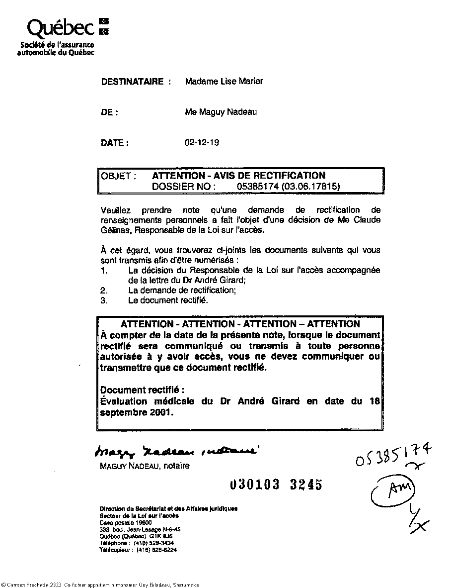 (posté le 10 février 2003) en réponse à la demande d'une copie de l'expertise de André Girard, madame White envoie une copie NON RECTIFIÉE de l'expertise. C'est la preuve, pour nous, de la mauvaise foi de monsieur Gélinas et ses comparses avec leurs copier-coller. On y remarque entre autres, que les annotations qui avaient été faites par les commissaires du Tribunal administratif du Québec et que l'on voit sur les copies supposément rectifiés par les collages sur les cotés et au bas des pages. C'est donc qu'il existe une autre copie vierge de toutes annotations et rectifications, à la Société de l'assurance automobile du Québec.