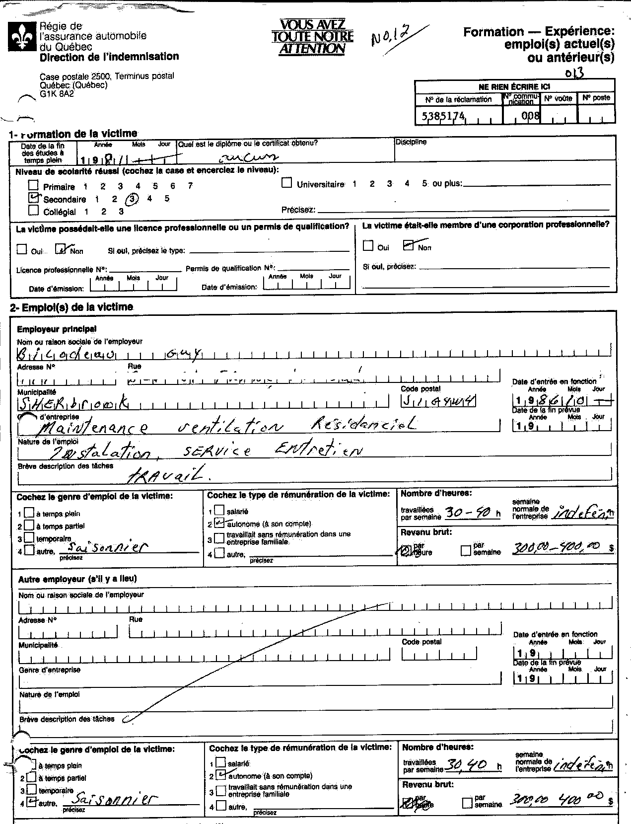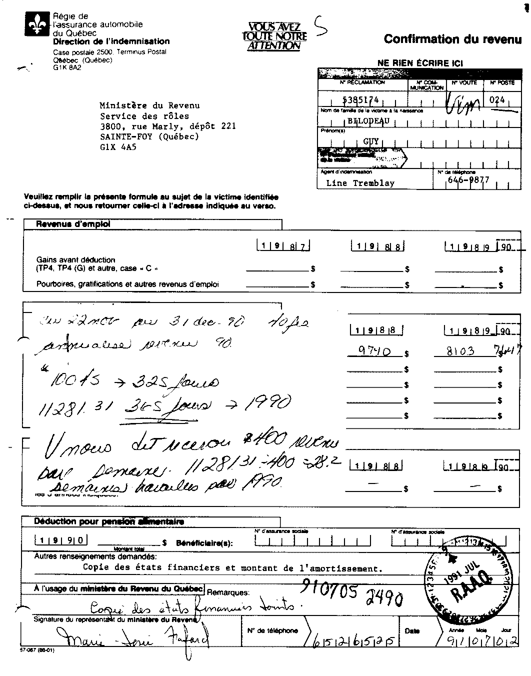 Il est important de voir ce que la Société de l'assurance automobile du Québec écrivait au suivi informatisé de monsieur Bilodeau et la façon dont madame Line Tremblay a calculé le salaire de monsieur Bilodeau.