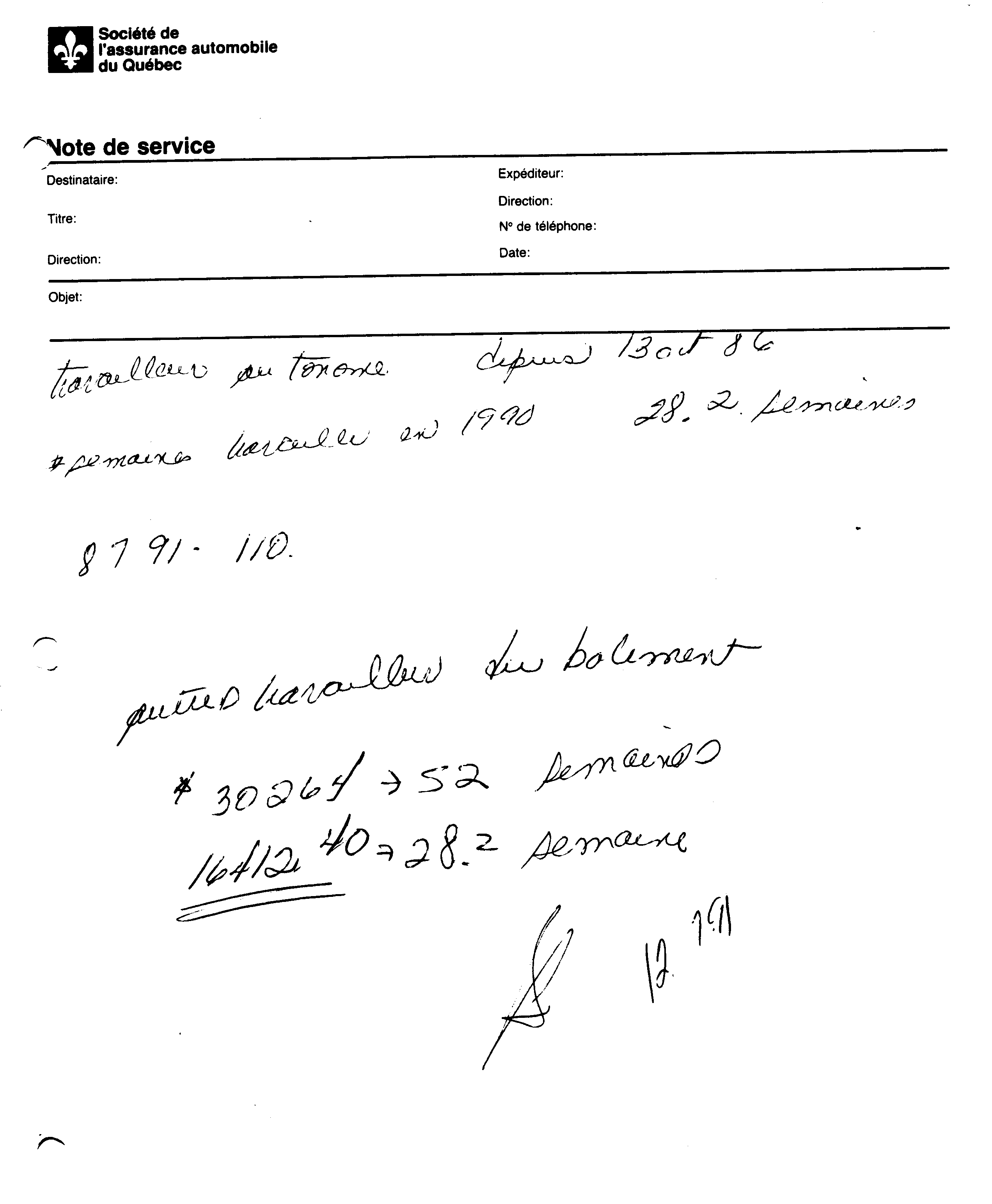 On y remarque : la façon dont l'agente a décidé que monsieur Bilodeau travaillait à mi-temps alors qu'il lui avait affirmé travailler à temps plein. En prenant l'affirmation de monsieur Bilodeau d'un salaire d'environ 400$/semaine, et en divisant le salaire annuel par ce 400. Elle arrive à 28 semaines. Nulle part dans les lois de la SAAQ, il n'est dit que le calcul doit se faire de cette façon... il y a même cité les façons dont doivent calculer les agents de la saaq... on se questionne... en a t-elle eu un gain quelconque ?