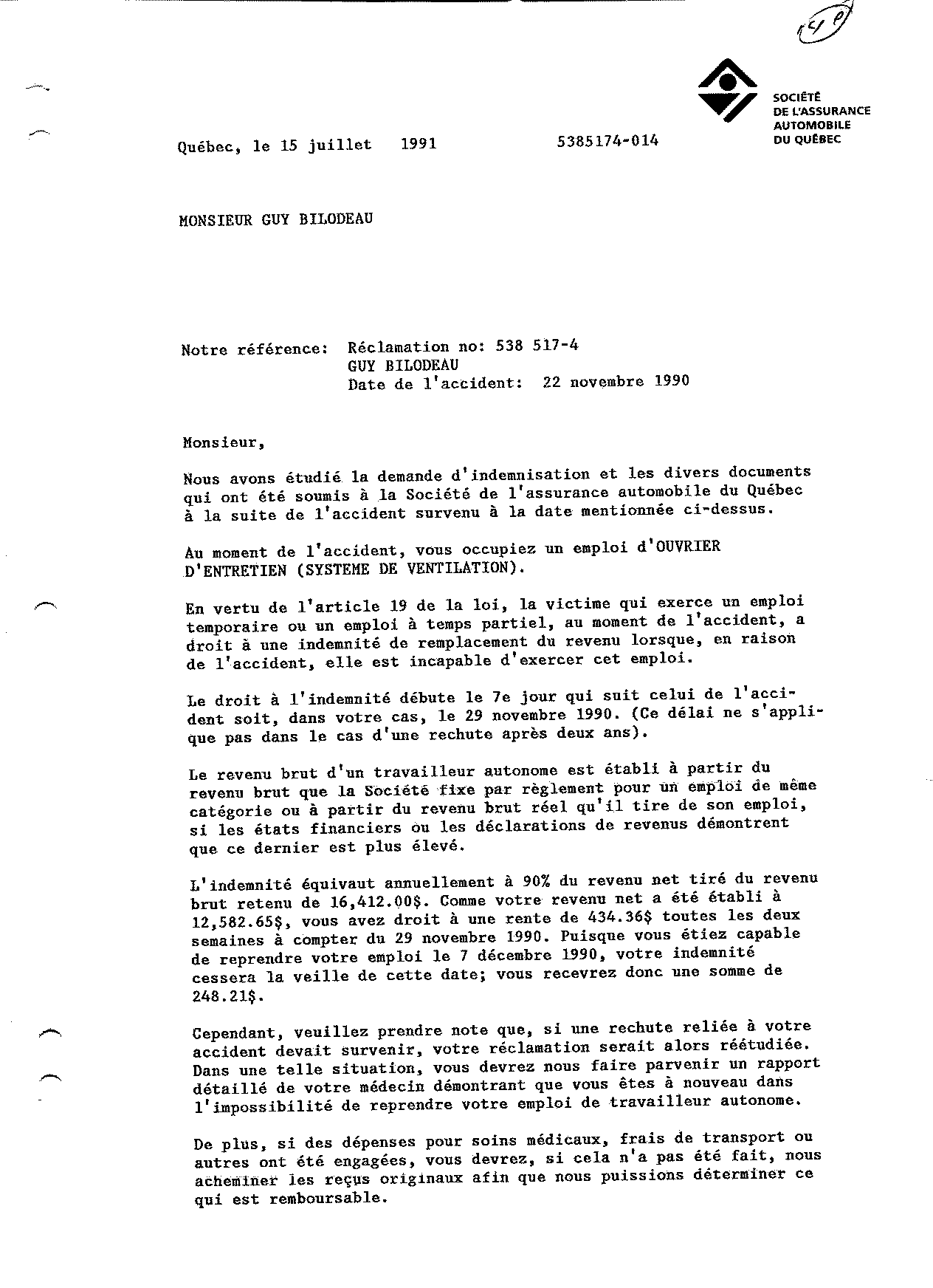Le 15 juillet 1991 L'agente Line Tremblay qui suit monsieur Bilodeau depuis le jour de l'accident, a décidé que monsieur Bilodeau travaillait à temps partiel (ce qui est faux, monsieur Bilodeau a contesté ce mensonge, mais ni la SAAQ ni la CAS n'en a jamais tenu compte