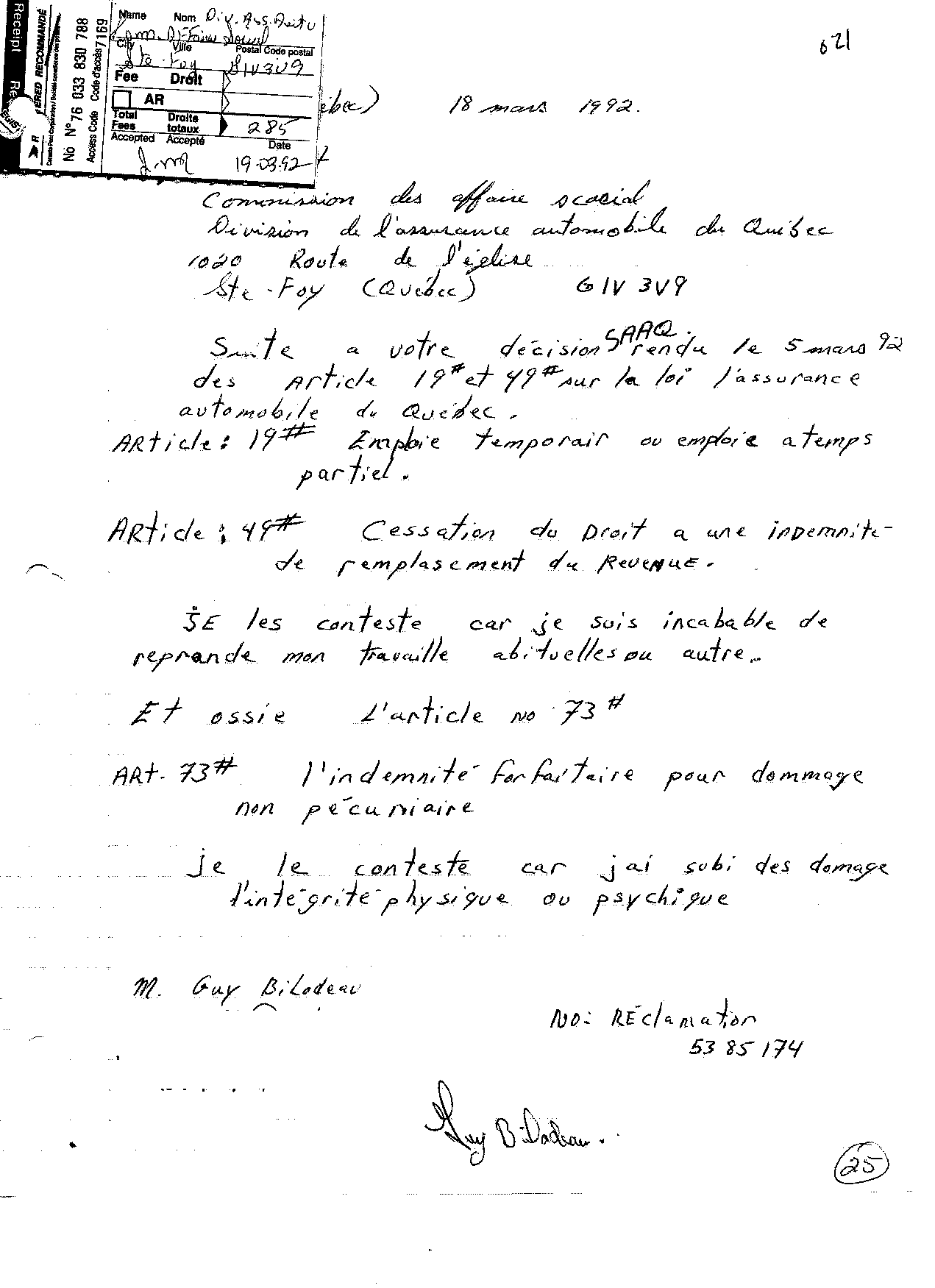 Le 13 décembre 2001 La décision est à vomir.. L'agente d'indemnisation invente carrément. La SAAQ les laisse libre de mentir! Elle a même le culot de spécifié à monsieur Bilodeau qu'elle exige qu'il justifie une prolongation des IRR après le 21 novembre 1992 Alors que la décision du TAQ ordonne le versement des IRR depuis juillet 1992 jusqu'à un temps indéfini...Elle laisse monsieur Bilodeau se morfondre et se décourager profondément alors qu'elle savait parfaitement que le remboursement au delà du 21 novembre 1992 serait effectué!