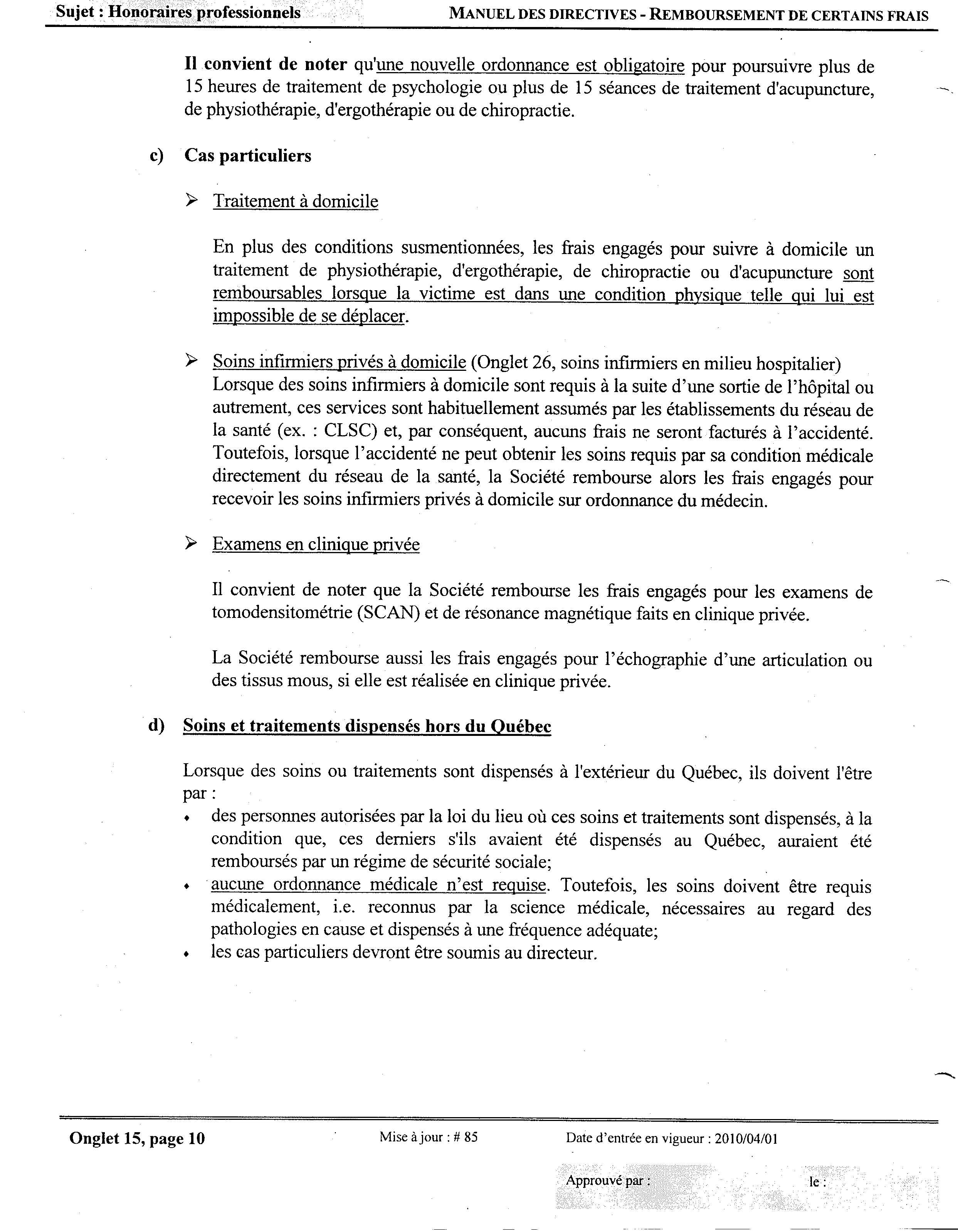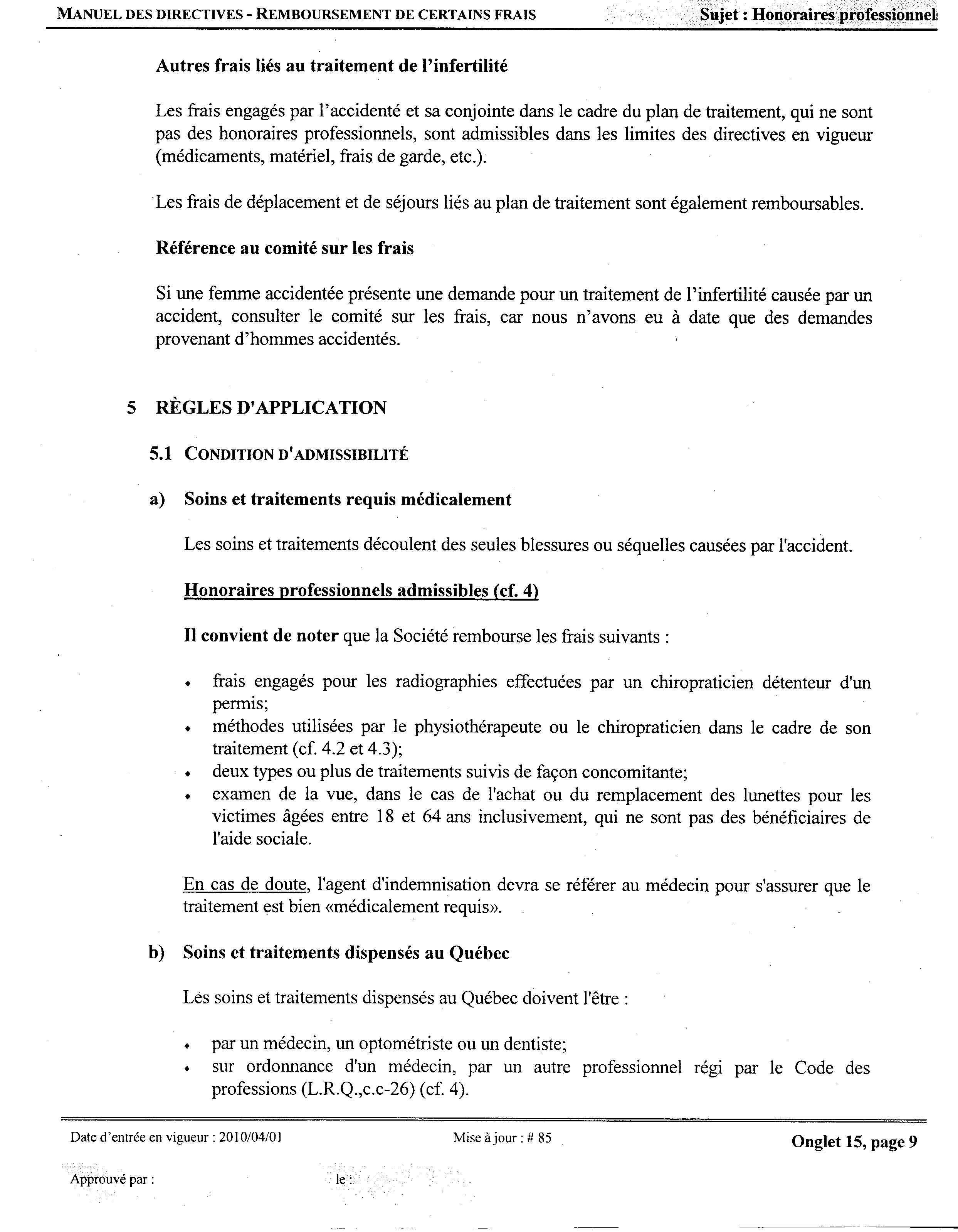 Les frais engagés par l'accidenté et sa conjointe dans le cadre du plan de traitement, qui ne sont pas des honoraires professionnels, sont admissibles dans les limites des directives en vigueur (médicaments, matériel, frais de garde, etc.)