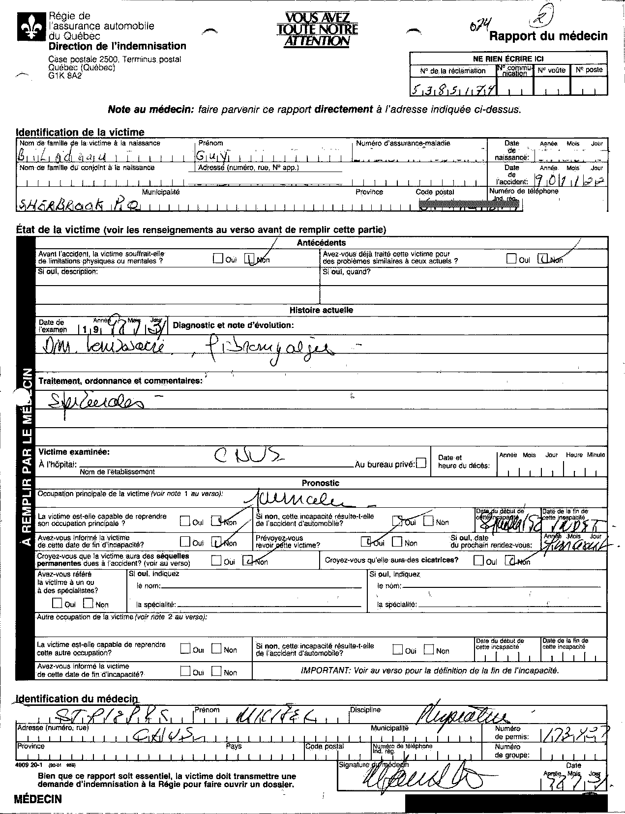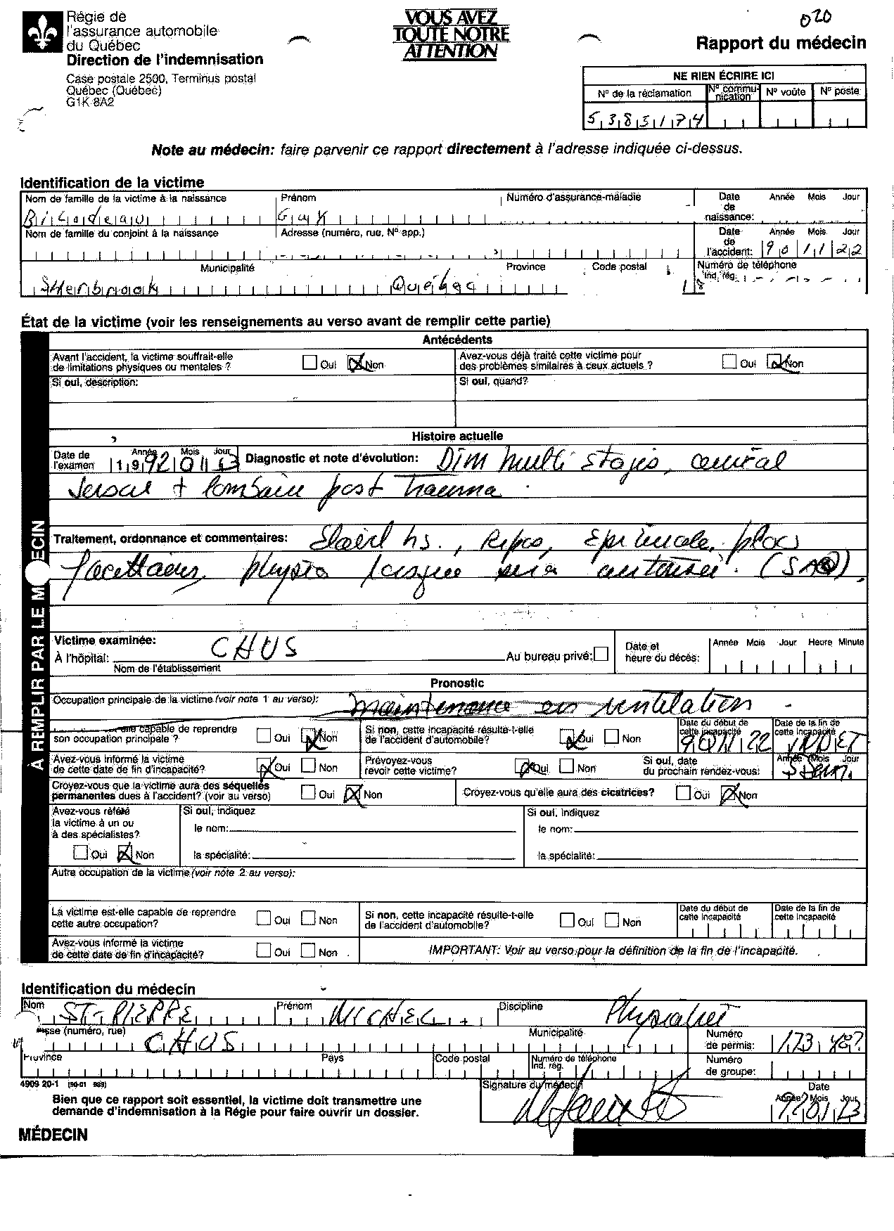 le docteur St-Pierre rend un rapport (13 janvier 1992) qui indique objectivement les séquelles dû à l'accident...