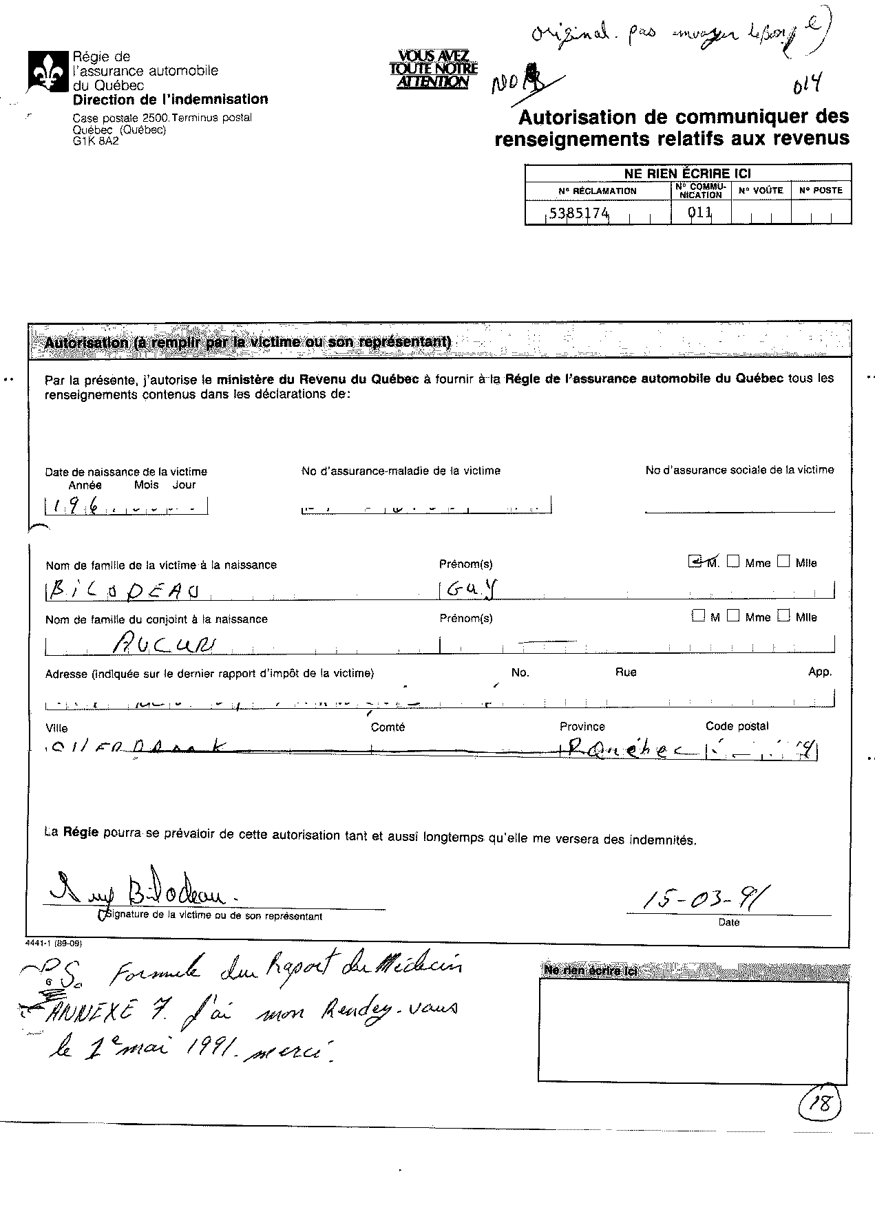 monsieur Bilodeau note à la SAAQ (15 mars 1991) qu'il devra attendre pour aller à un rendez-vous, pourtant la SAAQ lui reprochera un silence médicale!