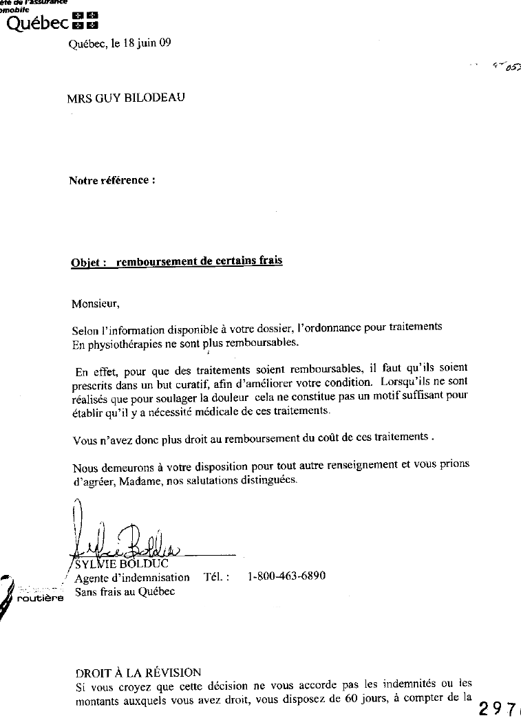 Dans sa révision, l'employée de "la direction de la révision" de la SAAQ indiquait que les traitements arrêtés en mai 2008 ne pouvaient être remboursé 'uniquement pour la douleur"