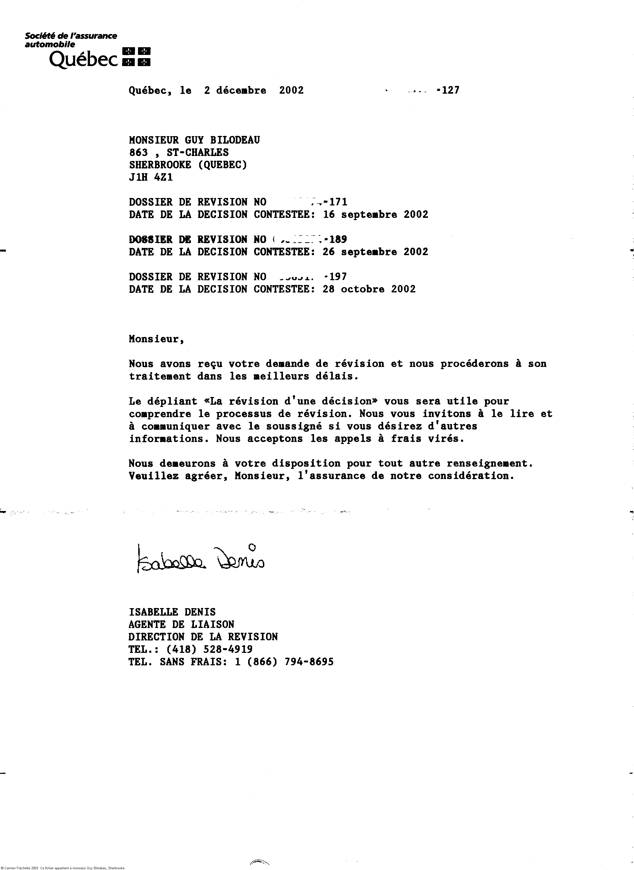 Réponse à la lettre du 12 novembre 2002 la direction de la révision de la Société de l'assurance automobile du Québec avise monsieur Bilodeau qu'elle procédera au traitement de ses demandes de révisions datées des