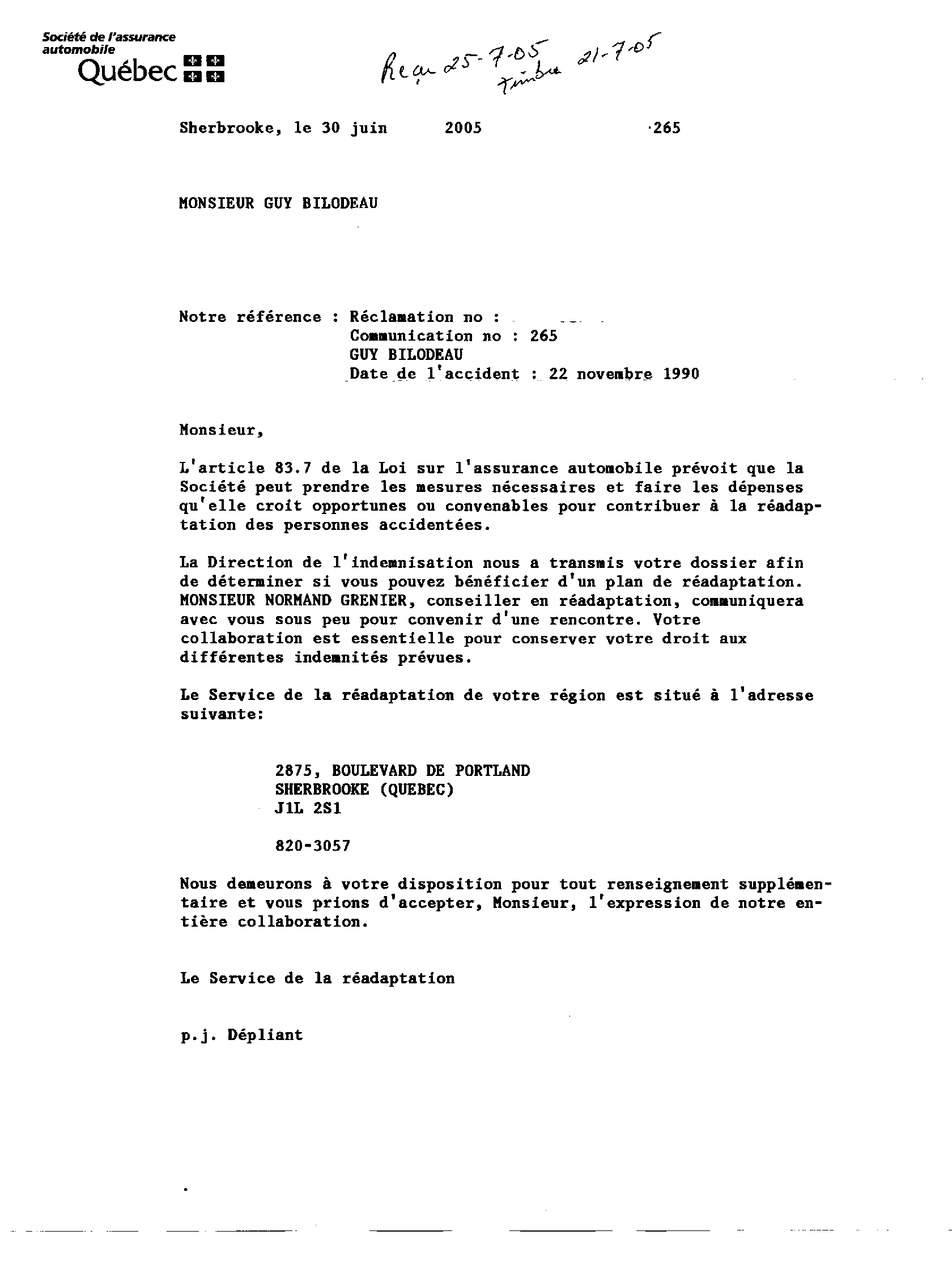 la Société de l'assurance automobile du Québec envoie une lettre informant que le dossier en réadaptation a été ré ouvert. L'agent est monsieur Normand Grenier. Un dépliant est incluse ainsi qu'une lettre expliquant la cause du retard.