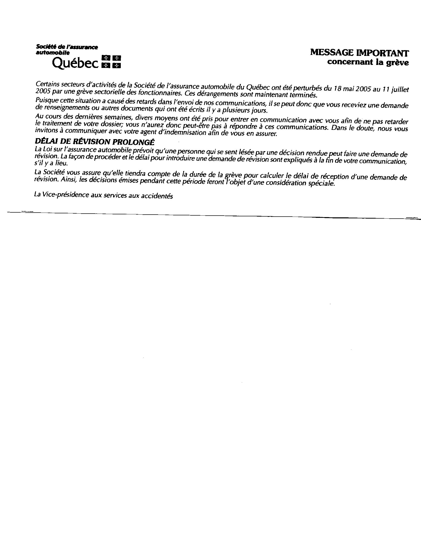 Certains secterus d'acitiviés de la Société de l'assurance automobile du Québec ont été perturbés du 18 mai 2005 au 11 juillet 2005 par une grève sectorielle des fonctionnaires. Ces dérangements sont maintenant terminée (...)