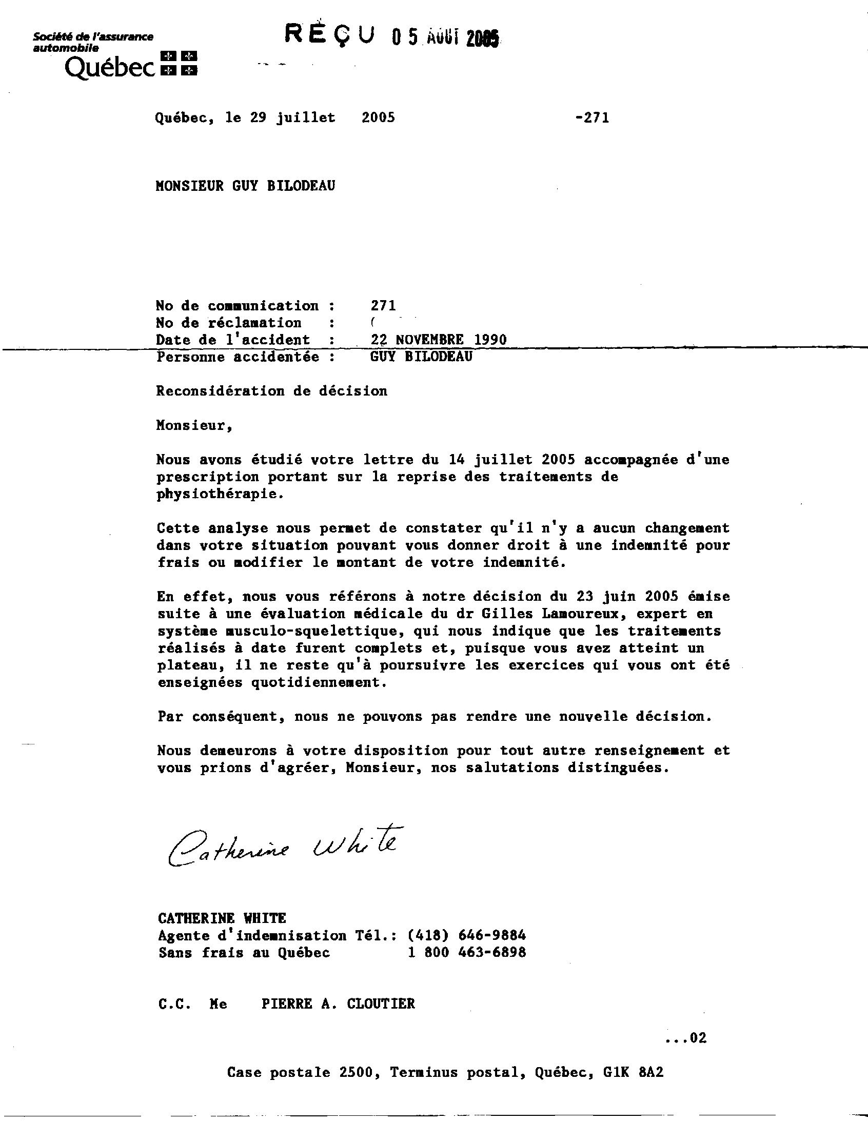 Catheine White de la Société de l'assurance automobile du Québec répond à la demande de reprises des traitements de physiothérapie en spécifiant qu'elle a étudié la lettre et la prescription (mais pas les rapports médicaux) elle estime qu'il n'y a aucun changement de situation.