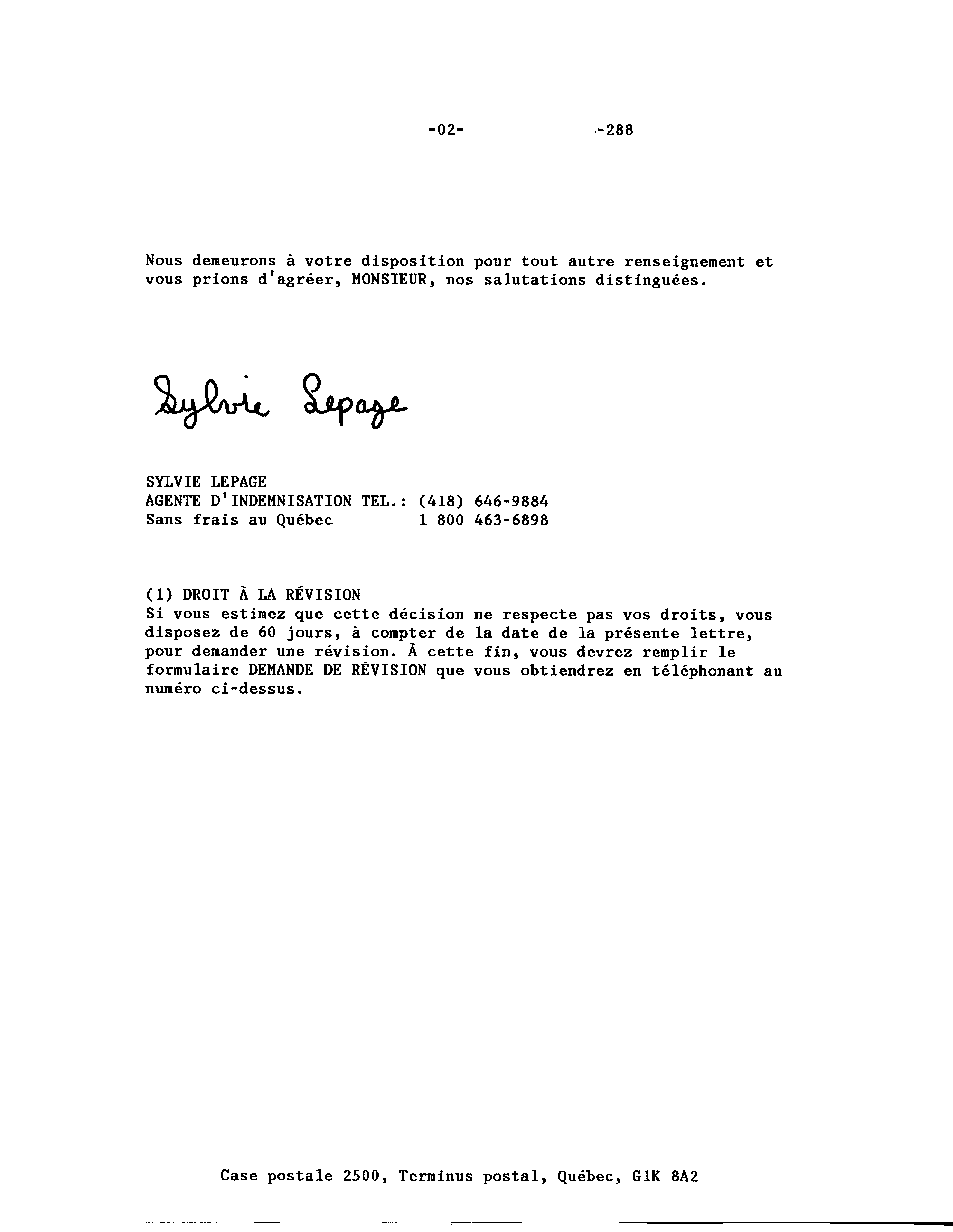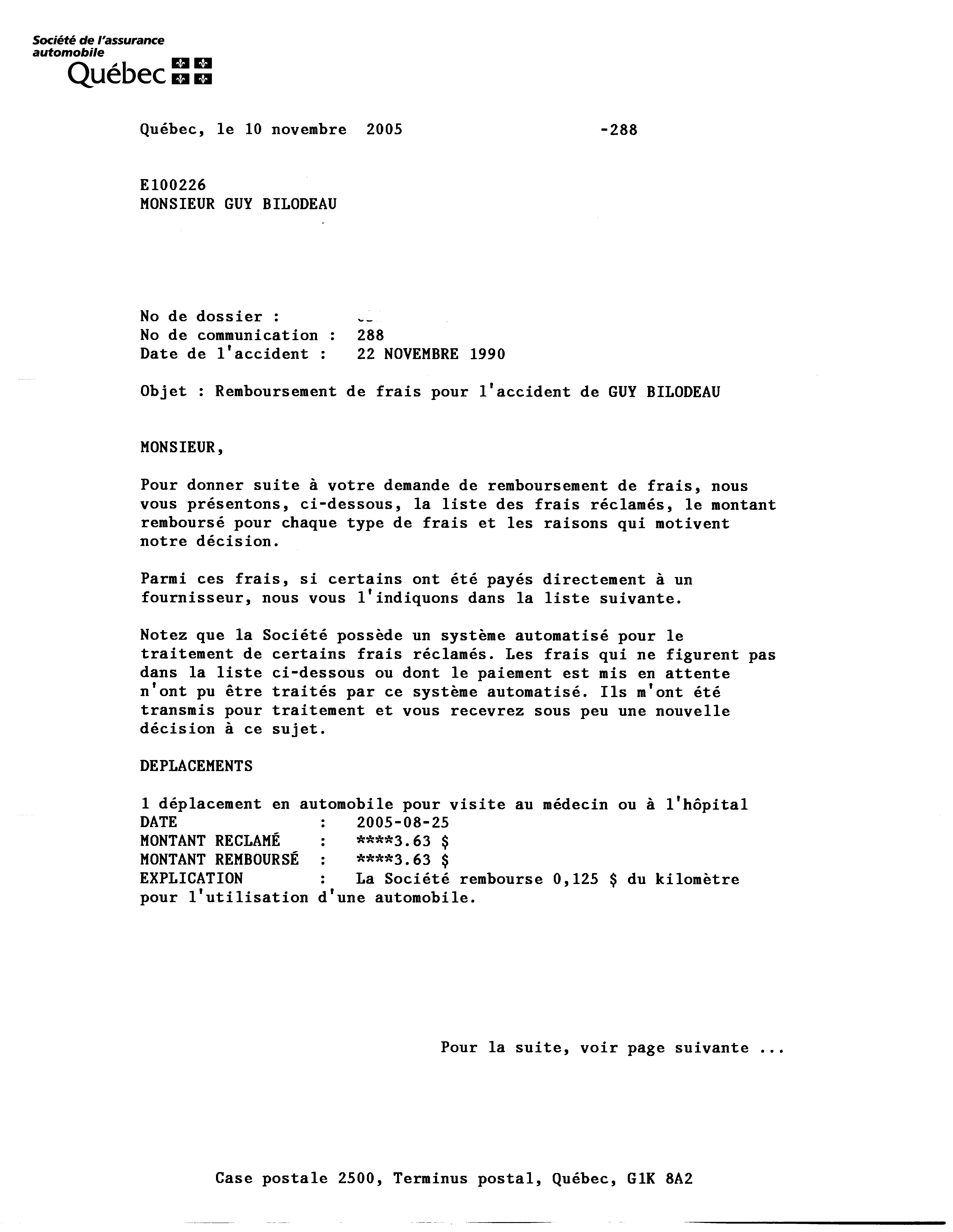 Sylvie Lepage, de la Société de l’assurance automobile du Québec envoie le paiement de la visite médicale du 25 août 2005