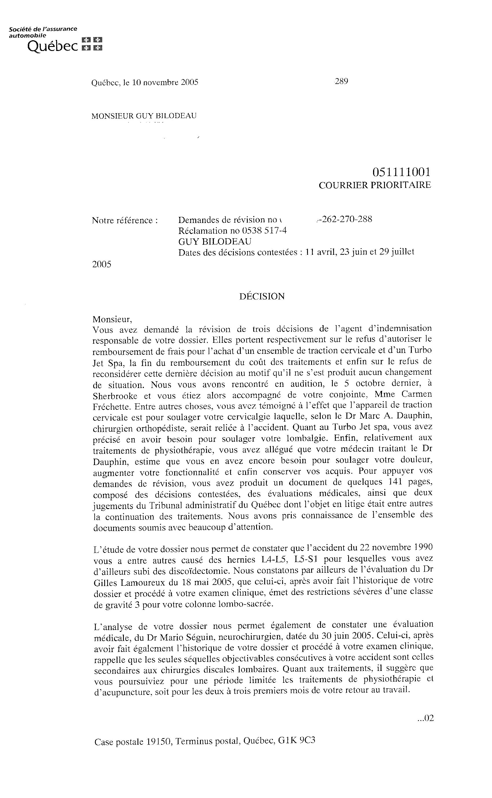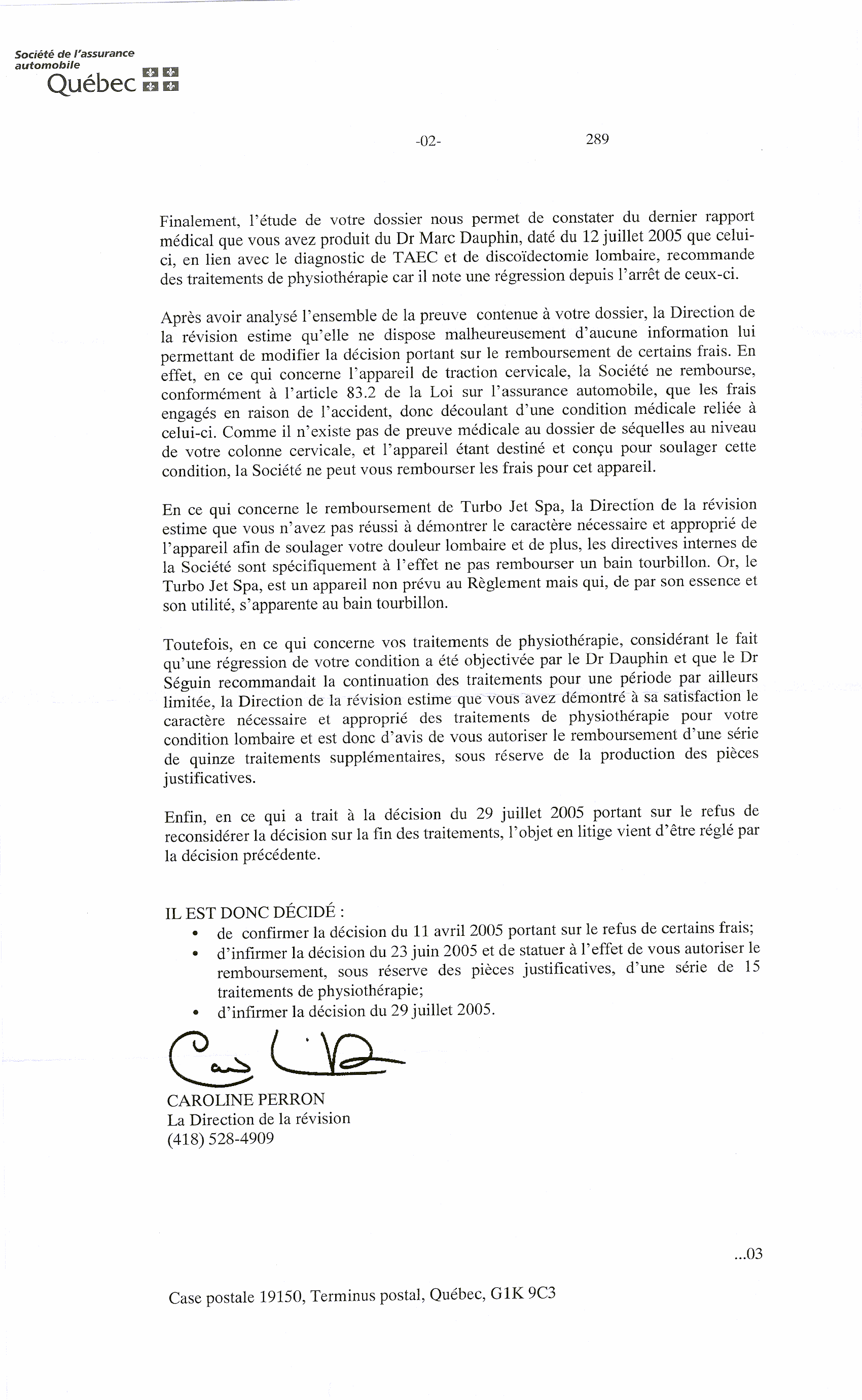 Caroline Perron du service de révision de la Société de l'assurance automobile du Québec rend une décision sur les demandes faites par monsieur Bilodeau.