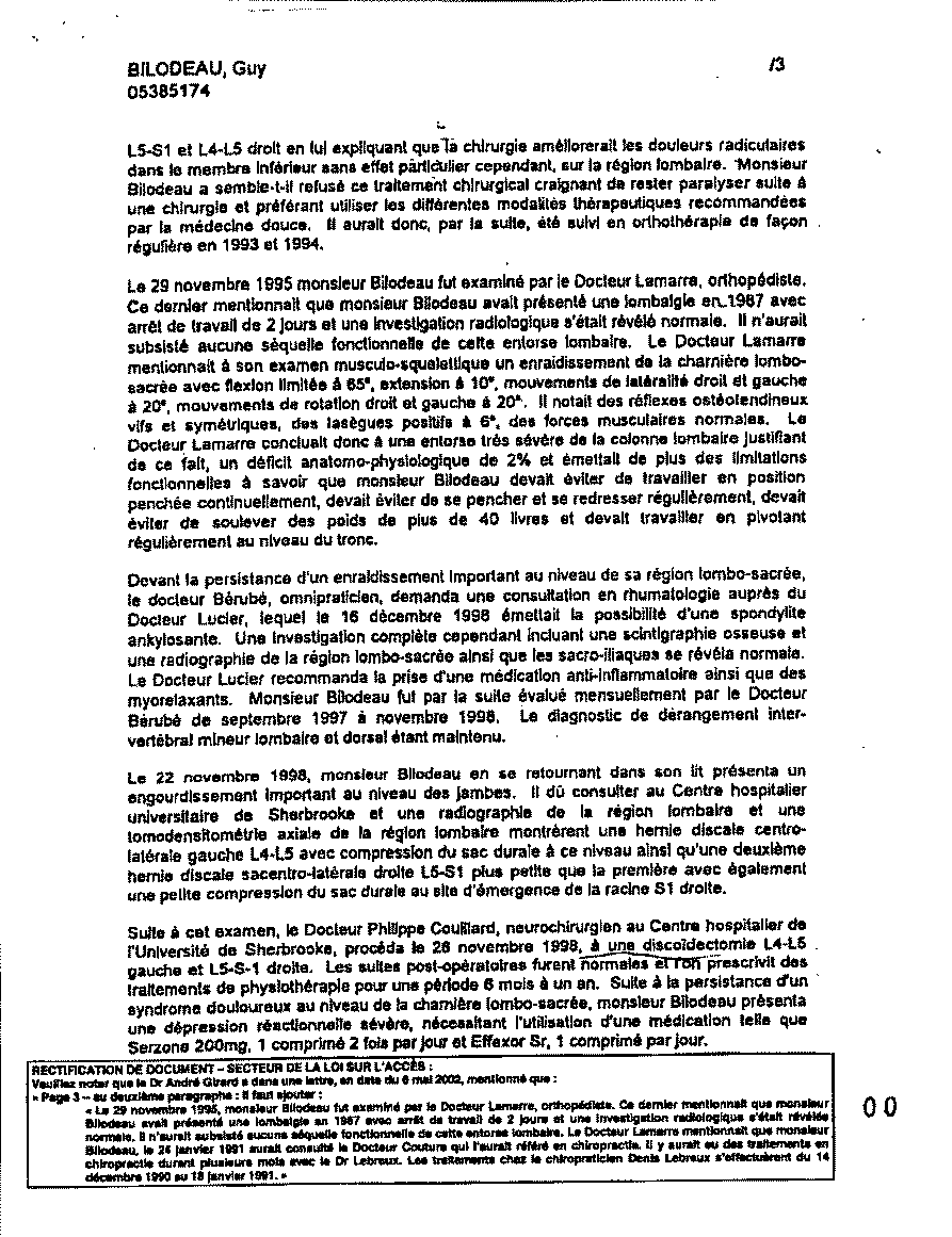 aurait recommandé une discoïdectomie L4-L5- L5-S1. Monsieur Bilodeau aurait refusé un traitement chirurgical craignant de demeurer paralyser et il aurait de nouveau opter pour différentes médecines douces avec plus ou moins d'amélioration. Il fut également évalué en rhumatologie où un diagnostic de spondylite ankylosante fut éliminé. On aurait par la suite maintenu un diagnostic de dérangement inter-vertébral mineur dorsal et lombaire. En novembre 1998, en se tournant simplement dans son lit, il y a exacerbation douloureuse importante des esthésies au niveau des membres inférieures. Une tomodensitométrie axiale de la région lombaire ayant de nouveau montré des hernies discales L4-L5 et L5-S1 aggravées ayant nécessité une discoïdectomie L4-L5 et L5-S1 effectuée par le Docteur Couillard, neurochirurgien.