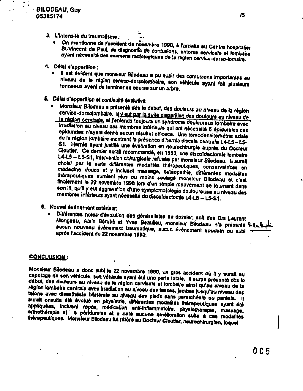 Monsieur Bilodeau a donc subi le 22 novembre 1990, un gros accident où il y aurait eu capotage de son véhicule, son véhicule ayant été une perte totale. Il aurait présenté dès le début, des douleurs au niveau de la région cervicale et lombaire ainsi qu'au niveau de la région lombaire centrale avec irradiation au niveau des fesses, jambes jusqu'au niveau des talons avec disesthésie bilatérale au niveau des pieds sans paresthésie ou parésie. Il aurait ensuite été évalué en physiatrie, différentes modalités thérapeutiques ayant été appliquées, incluant repos, médication anti-inflammatoire, physiothérapie, massage, orthothérapie et 5 péridurales et a noté aucune amélioration suite à ces modalités thérapeutiques. Monsieur Bilodeau fut référé au Docteur Cloutier, neurochirurgien, lequel