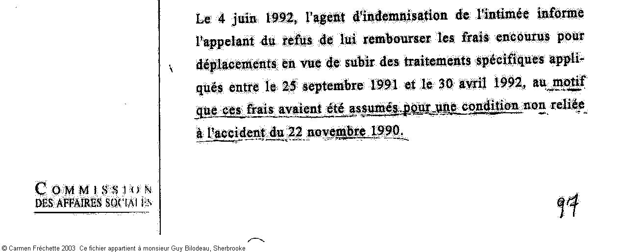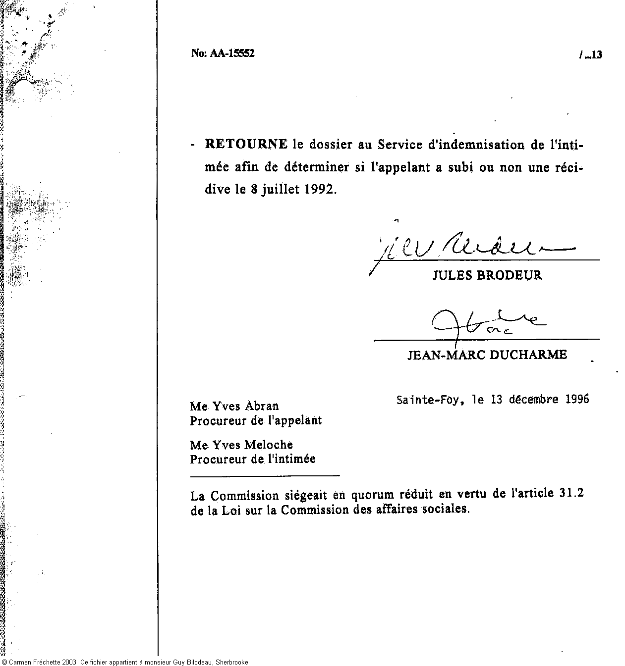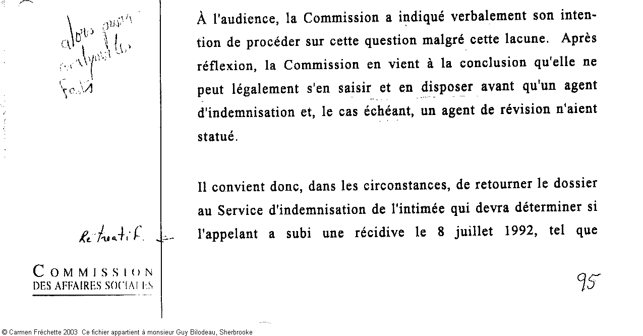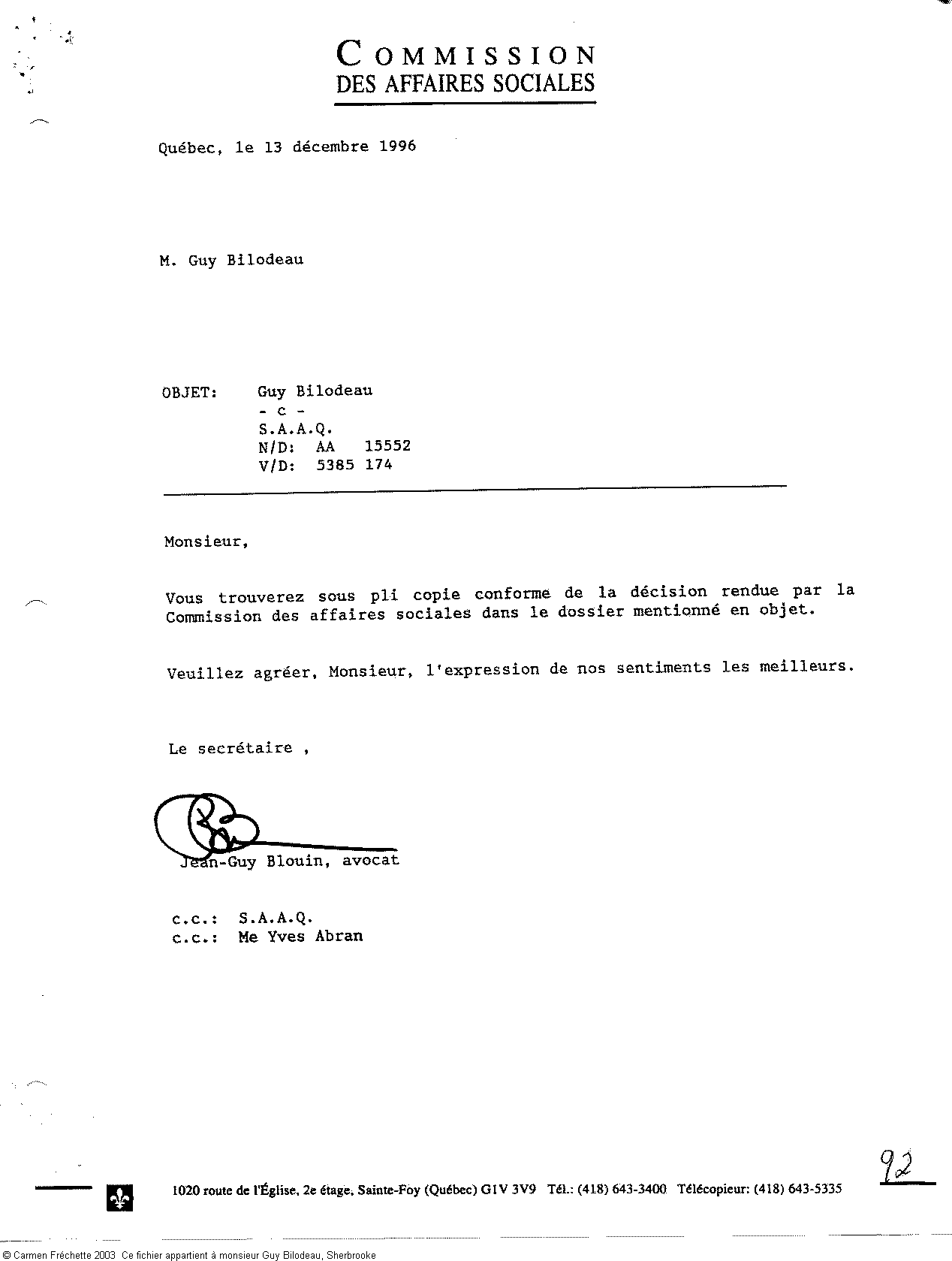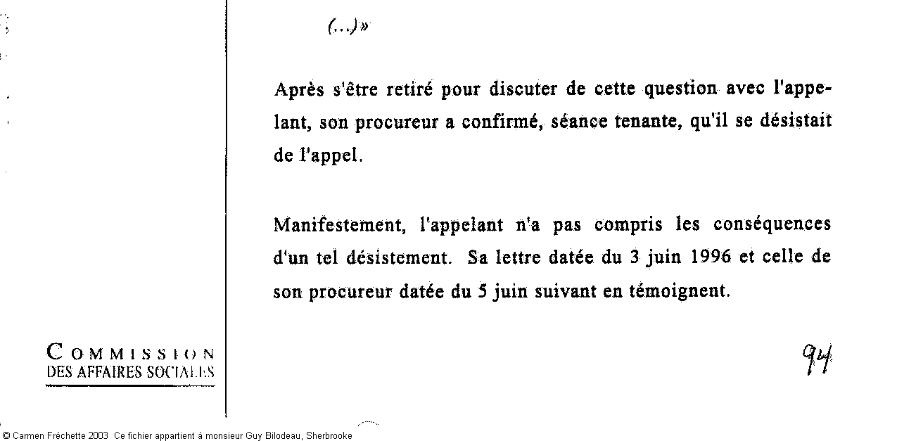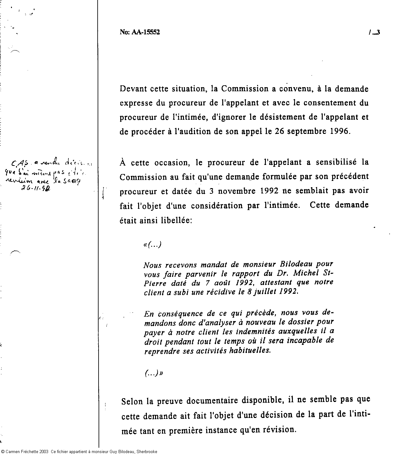Le 13 décembre 1996, la CAS (commission des affaires sociales, maintenant tribunal administratif du Québec) abuse volontairement de ses pouvoirs lors de la demande de révision.