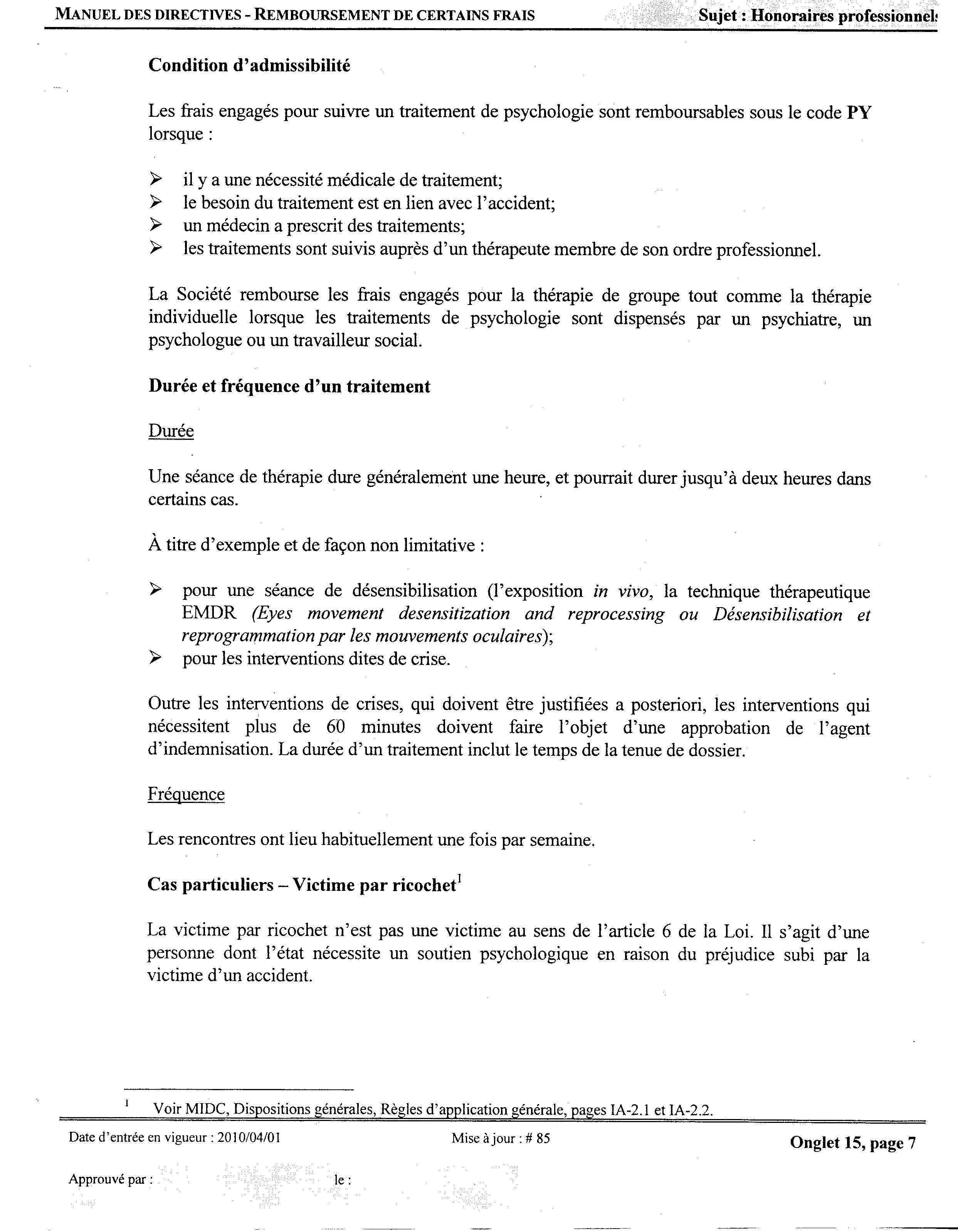 La victime par ricochet a droit, sur présentation d'une prescription, au remboursement des frais engagés pour recevoir un maximum de 15 heures de traitements de psychologie. Les frais sont remboursables sous le code VR,