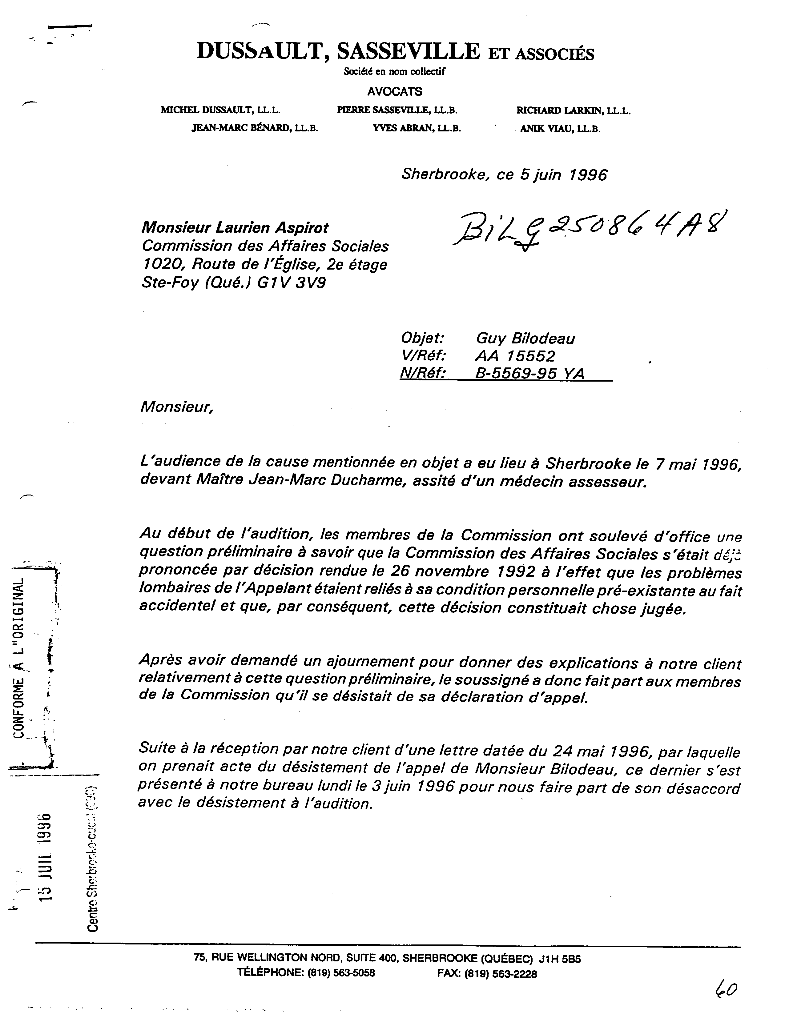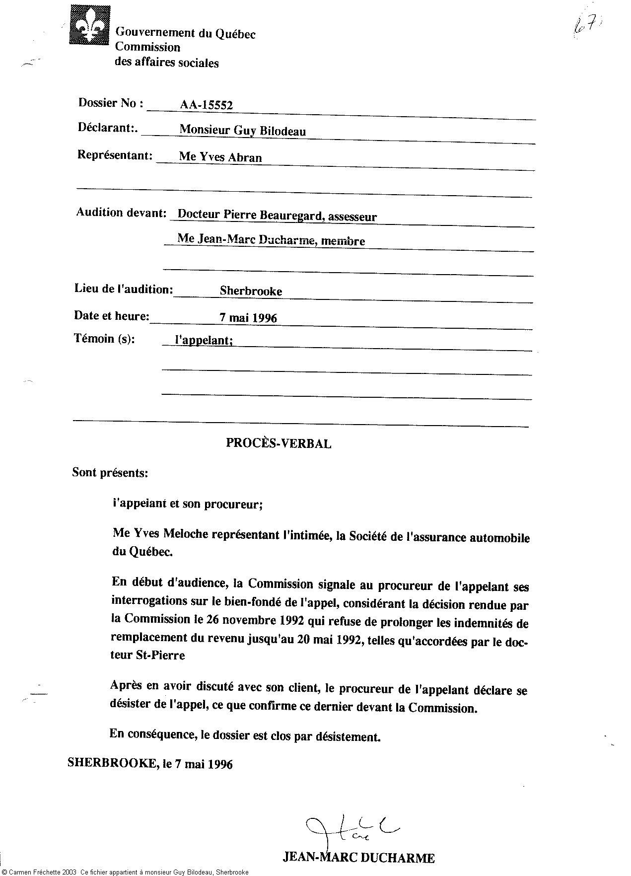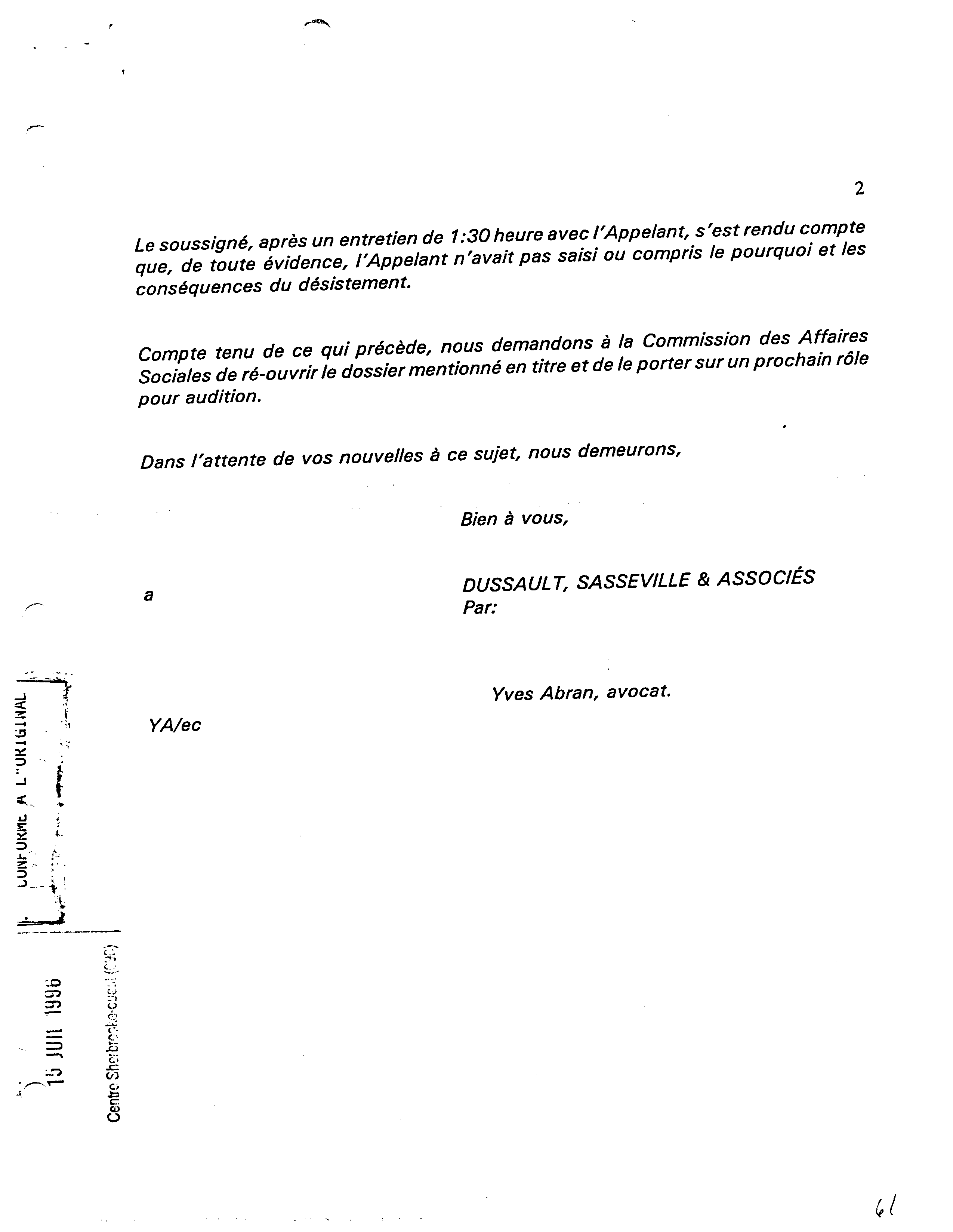 En 1996, Guy a un nouvel avocat, m. Yves Abran. Guy avait demandé à être entendu par la CAS car ils (les commissaires) n'avaient pas prit en compte la preuve médicale au dossier.