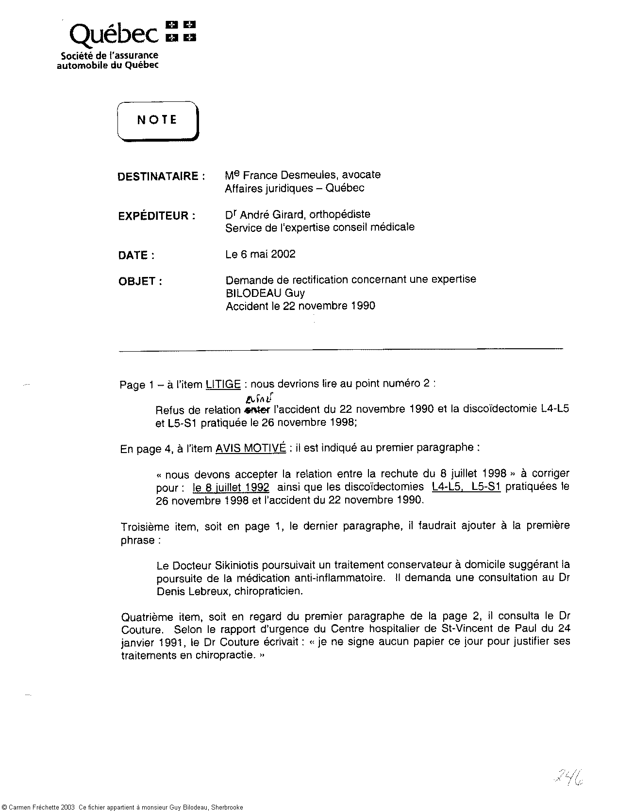 Nous demandons au Dr Girard de corriger des erreurs et coquilles de son expertise. Il est d'accord. (voir fichiers nommé 2002_5_6_expertise_Girard_modifications1de2.png et la page 2 de 2...