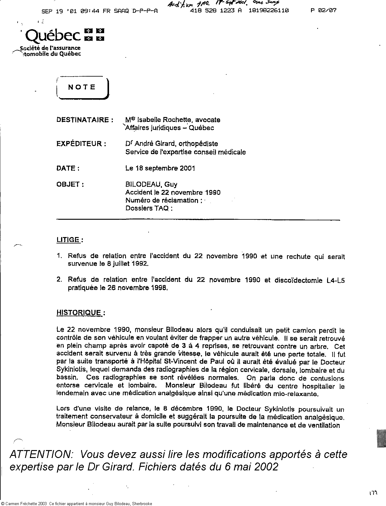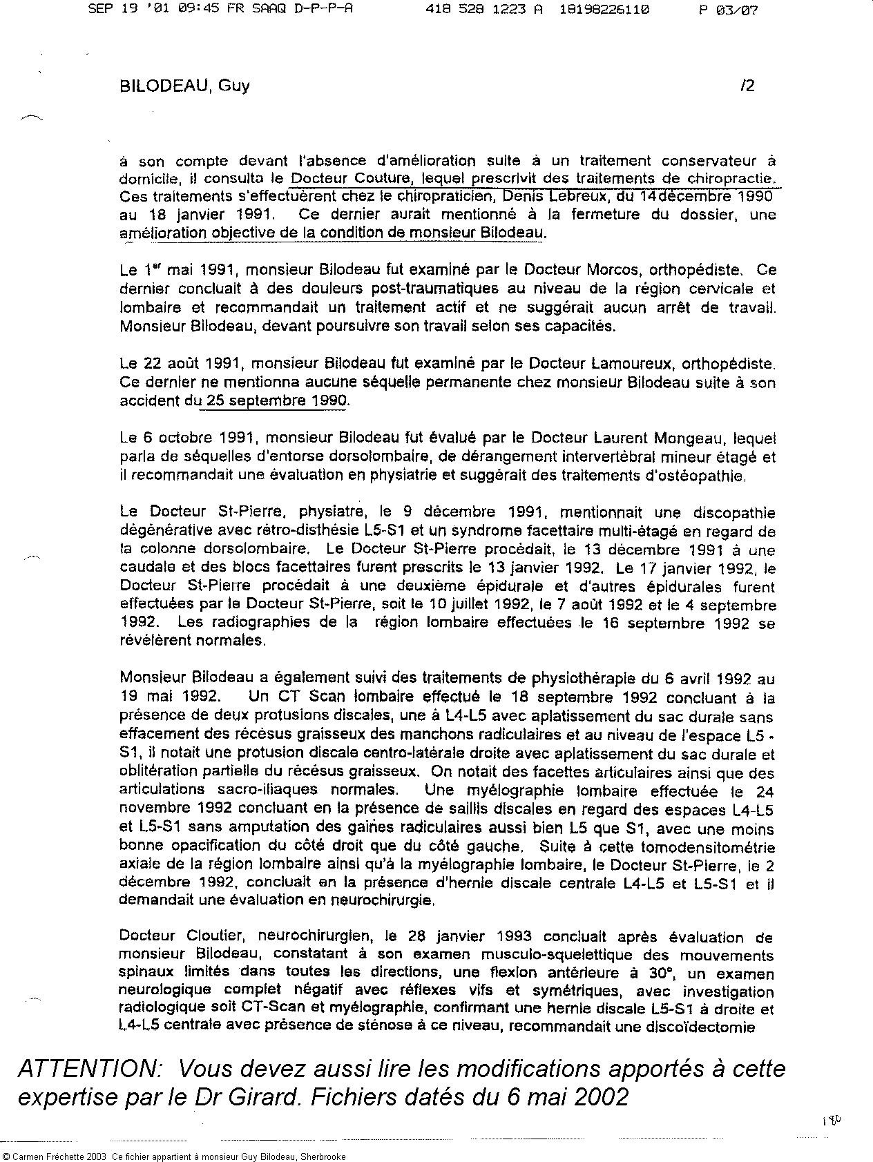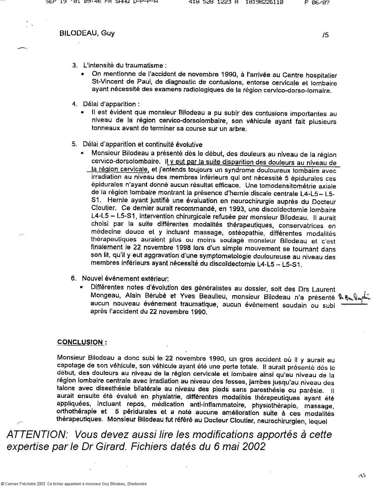 Le Dr André Girard, médecin mandaté par la saaq a évalué le dossier médicale complet et a conclu que les séquelles des blessures sont directement liées à l'accident de 1990.