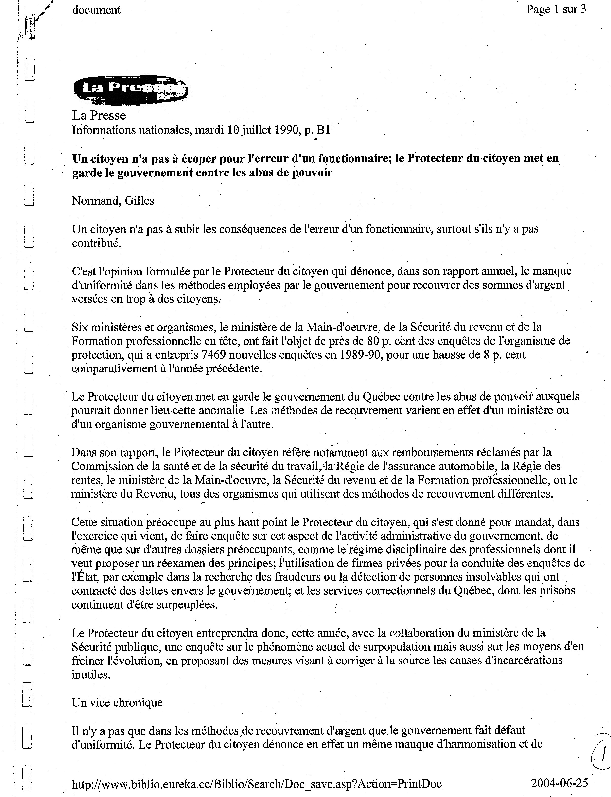 le Protecteur du citoyen met en garde le gouvernement contre les abus de pouvoir Normand Gilles Un citoyen n'a pas à subir les conséquences de l'erreur d'un fonctionnaire, surtout s'ils n'y a pas contribué.