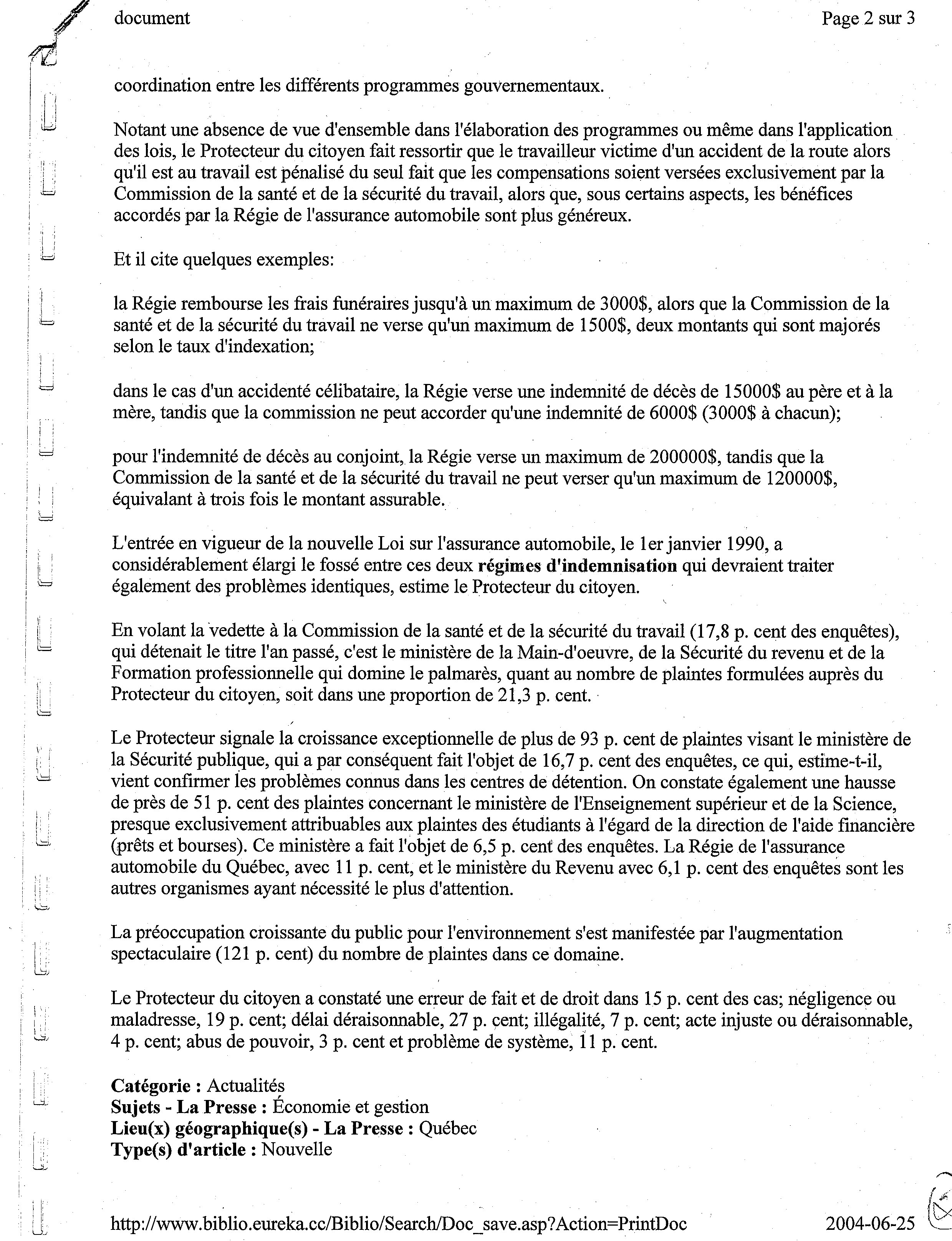 Notant une absence de vue d'ensemble dans l'élaboration des programmes ou même dans l'application des lois, le Protecteur du citoyen fait ressortir que le travailleur victime d'un accident de la route alors qu'il est au travail est pénalisé du seul fait que les compensations soient versées exclusivement par la Commission de la santé et de la sécurité du travail, alors que, sous certains aspects, les bénéfices accordés par la Régie de l'assurance automobile sont plus généreux.