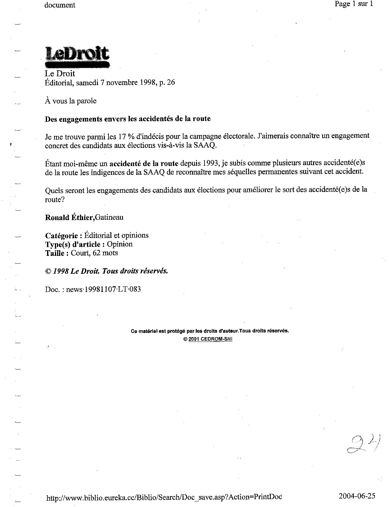 Le Droit Éditorial, samedi 7 novembre 1998, p. 26 À vous la parole
