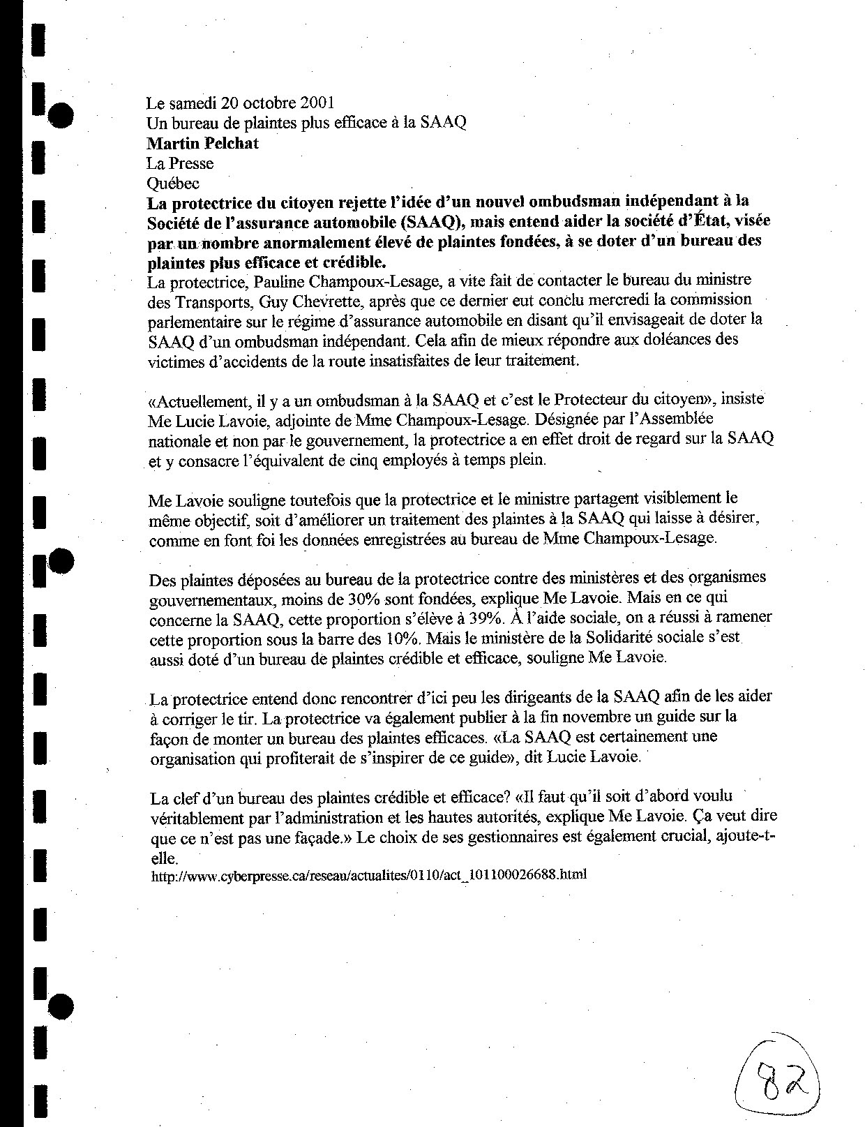 «Actuellement, il y a un ombudsman à la SAAQ et c'est le Protecteur du citoyen», insiste Me Lucie Lavoie, adjointe de Mme Champoux-Lesage. Désignée par l'Assemblée nationale et non par le gouvernement, la protectrice a en effet droit de regard sur la SAAQ et y consacre l'équivalent de cinq employés à temps plein. Me Lavoie souligne toutefois que la protectrice et le ministre partagent visiblement le même objectif, soit d'améliorer un traitement des plaintes à la SAAQ qui laisse à désirer, comme en font foi les données enregistrées au bureau de Mme Champoux-Lesage.
