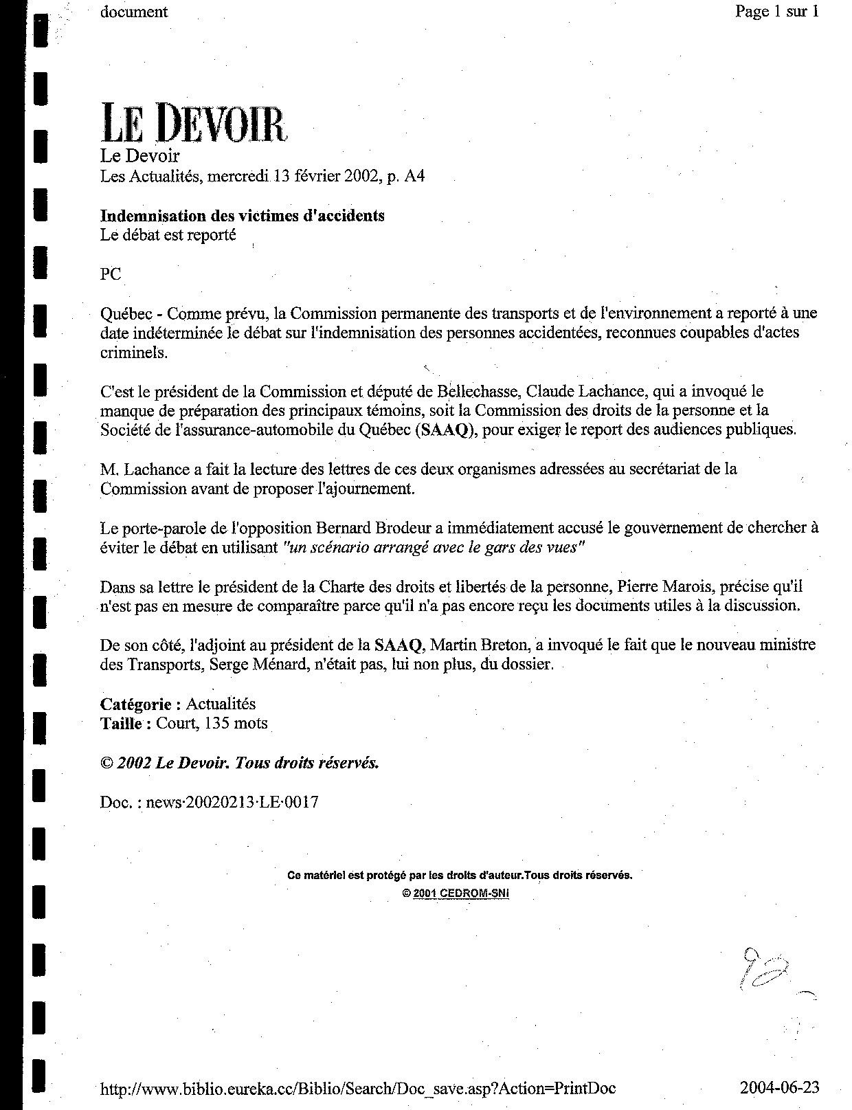 Le débat est reporté Le Devoir Les Actualités, mercredi.13 février 2002, p. A4 PC