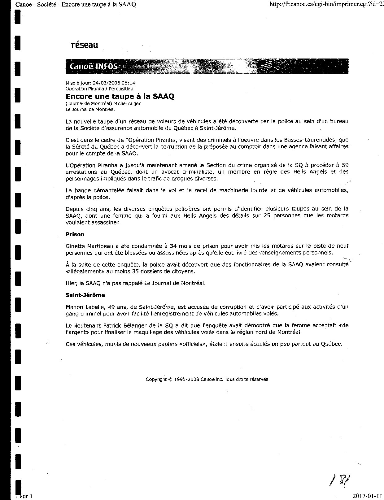 La nouvelle taupe d'un réseau de voleurs de véhicules a été découverte par la police au sein d'un bureau de la Société d'assurance automobile du Québec à Saint-Jérôme. C'est dans le cadre de l'Opération Piranha, visant des criminels à l'oeuvre dans les Basses-Laurentides, que la Sûreté du Québec a découvert la corruption de la préposée au comptoir dans une agence faisant affaires pour le compte de la SAAQ. L'Opération Piranha.a jusqu'à maintenant amené la Section du crime organisé de la SQ à procéder à 59 arrestations au Québec, dont un avocat criminaliste, un membre en règle des tiens Angels et des personnages impliqués dans le trafic de drogues diverses.