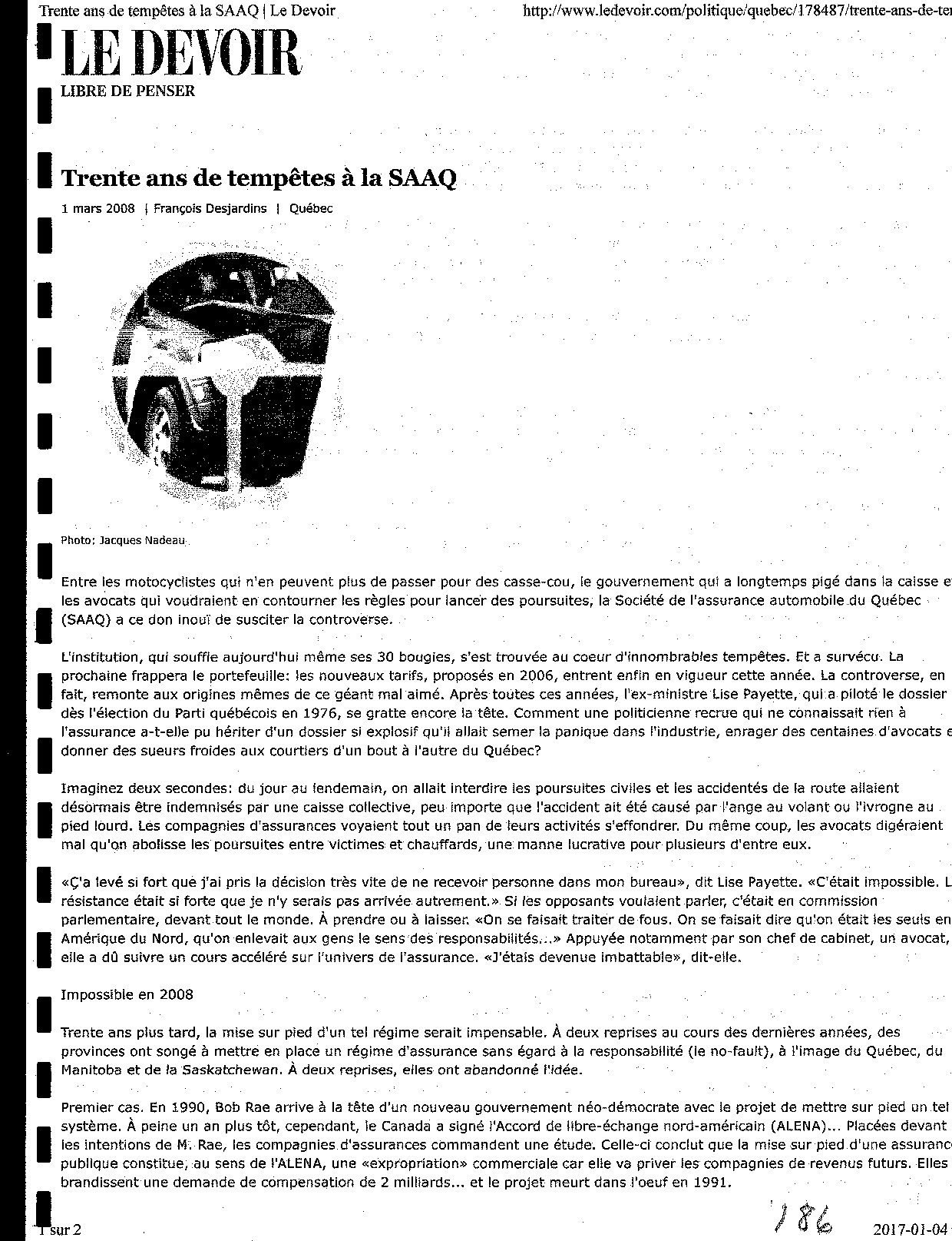 «Ç'a levé si fort que j'ai pris la décision très vite de ne recevoir personne dans mon bureau», dit Lise Payette. «C'était impossible. la résistance était si forte que je n'y serais pas arrivée. autrement.». Si lés opposants voulaient. parler, c'était en commission parlementaire, devant.tout le monde. À prendre ou à laisser. «On se faisait traiter de fous. On se faisait dire qu'on était les seuls en Amérique du Nord, qui osait enlevait aux gens le sens des.responsabilités» Appuyée notamment par son chef de cabinet, un avocat, elle a dû suivre un cours accéléré sur l'univers de l'assurance. «J'étais devenue imbattable», dit-elle.
