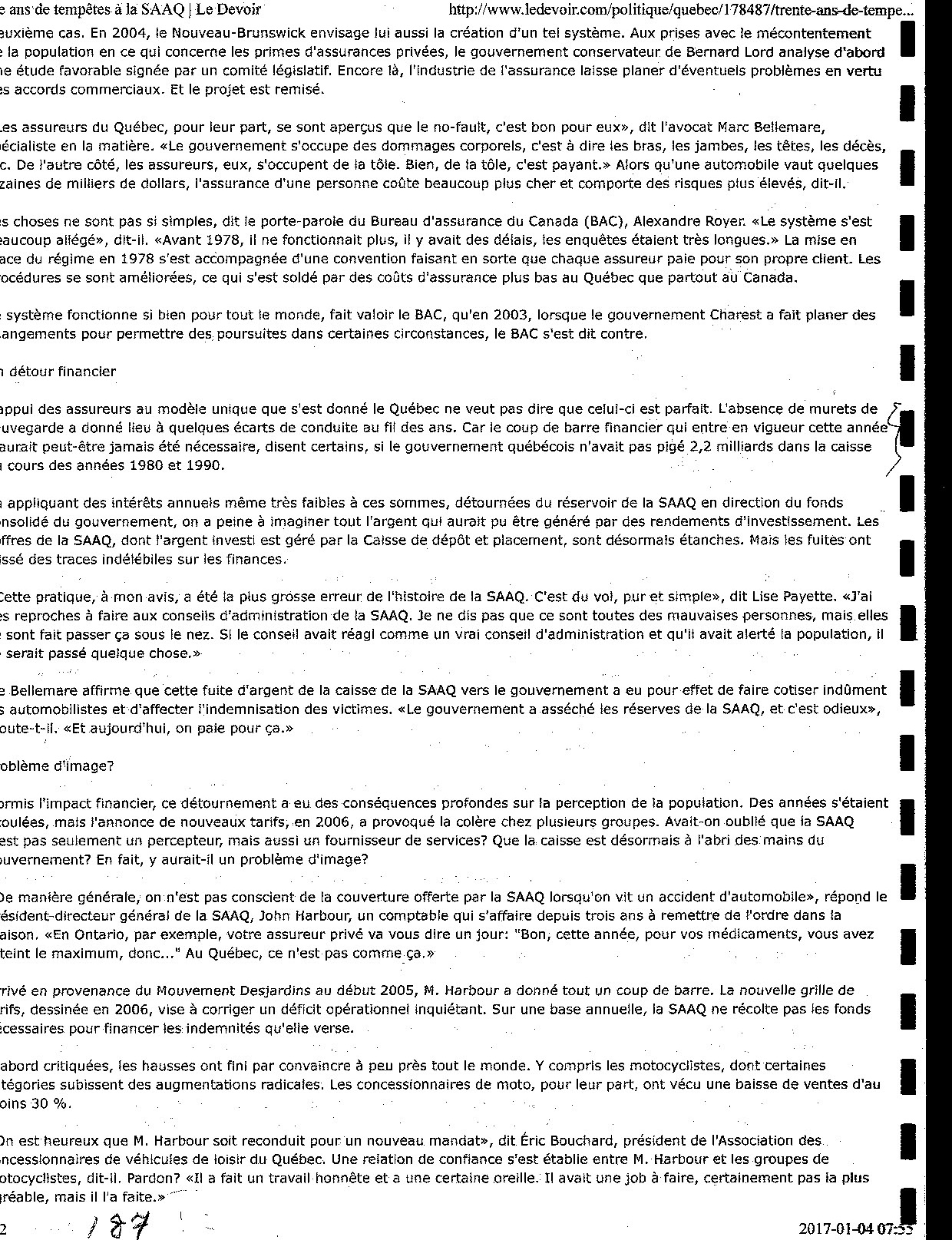 Cette pratique,.à mon avis, a été la plus grosse erreur de l'histoire de la SAAQ. C'est du vol, pur et simple», dit Lise Payette. «J'ai des reproches à faire aux conseils d'administration de la SAAQ. Je ne dis pas que ce sont toutes des mauvaises personnes, mais elles se sont fait passer ça sous le nez. Si le conseil avait réagi comme un vrai conseil d'administration et qu'il avait alerté la population, il serait passé quelque chose.» Bellemare affirme. que cette fuite d'argent de la caisse de la SAAQ vers le gouvernement a eu pour effet de faire cotiser indûment les automobilistes et d'affecter l'indemnisation des victimes. «Le gouvernement a.asséché les réserves de: la SAAQ, et c'est odieux», ajoute-t-il: «Et aujourd'hui, on paie pour ça.»