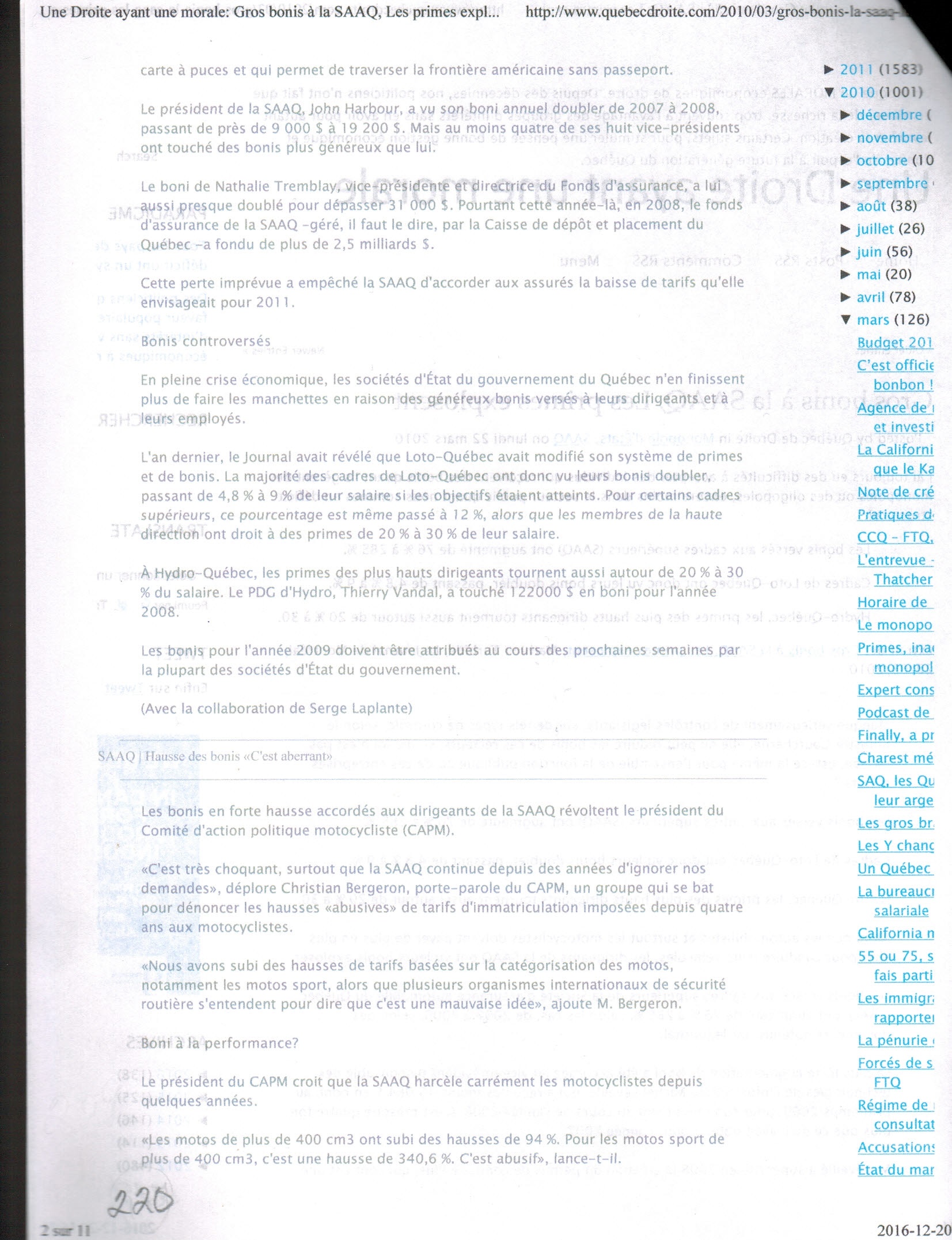 Les bonis versés aux cadres supérieurs (SAAQ) ont augmenté de 76 % à 285 %. Cadres de Loto-Québec ont donc vu leurs bonis doubler, passant de 4,8 % à 9 %. Hydro-Québec, les primes des plus hauts dirigeants tournent aussi autour de 20 % à 30. Extrait de: Gros bonis à la SAAQ, Les primes explosent, Mathieu Turbide, Le journal de Montréal, 22 /03 /2010