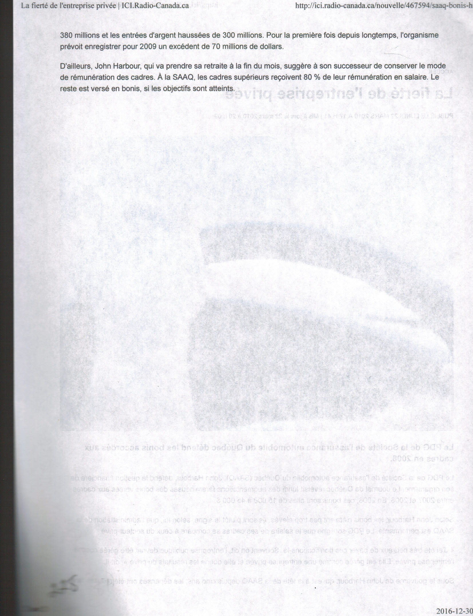 Le PDG de la Société de l'assurance automobile du Québec (SAAQ), John Harbour, défend la gestion financière de son organisme. Le Journal de Québec révélait lundi des augmentations faramineuses des bonis versés aux cadres entre 2007 et 2008. En 2008, ces bonis sont allés de 15 000 à 45 000 $.
