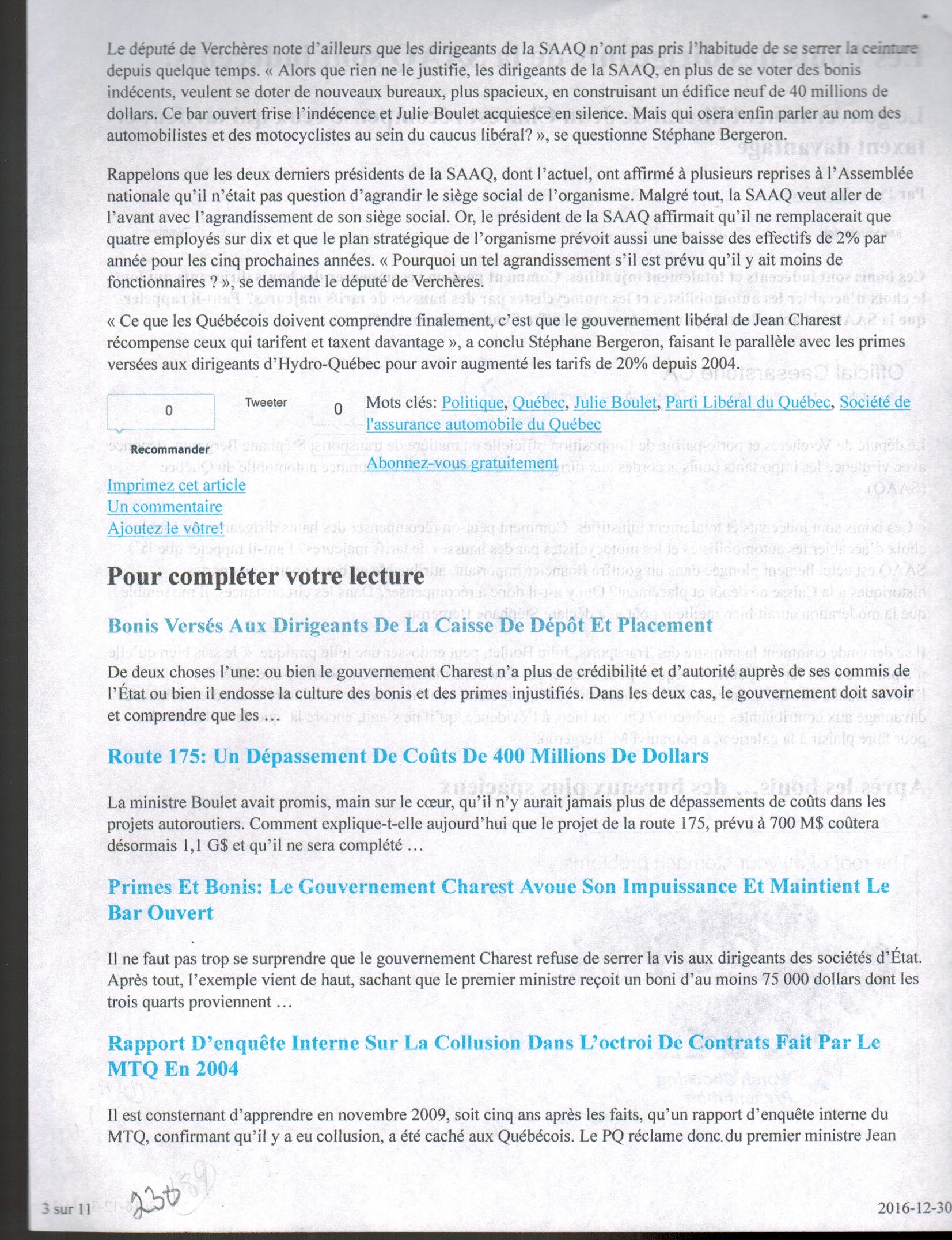 Il se demande comment la ministre des Transports, Julie Boulet, peut endosser une telle pratique. « Je sais bien qu'elle n'a plus, de toute façon, l'autorité requise pour exercer ses fonctions mais comment pourra-t-elle défendre l'indéfendable, elle qui est membre d'un gouvernement qui prétend vouloir se serrer la ceinture avant d'en demander davantage aux contribuables québécois? On voit bien, à l'évidence, qu'il ne s'agit, encore là, que de belles paroles pour faire plaisir à la galerie », a poursuivi M. Bergeron.