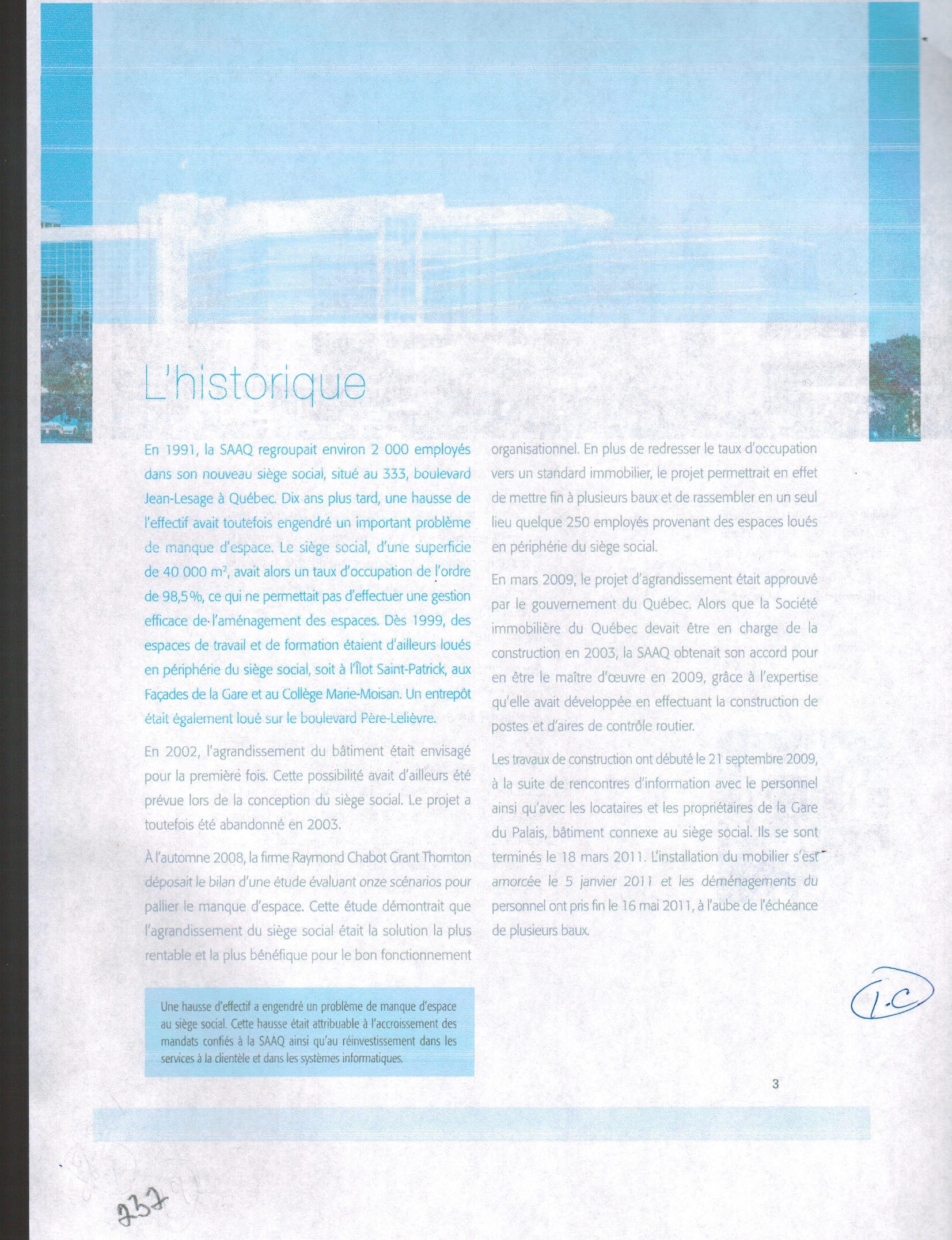 En 1991, la SAAQ regroupait environ 2 000 employés dans son nouveau siège social, situé au 333, boulevard Jean-Lesage à Québec. Dix ans plus tard, une hausse de l'effectif avait toutefois engendré un important problème de inanque d'espace. Le siège social, d'une Superficie de 40 000 m', avait alors un taux d'occupation de l'ordre de 98,5%, ce qui ne permettait pas d'effectuer une gestion efficace de- l'aménagement des espaces. Dès 1999, des espaces de travail et de formation étaient d'ailleurs loués en périphérie du siège social, soit à l'Îlot Saint-Patrick, aux Façades de la Gare et au Collège Marie-Moisan. Un entrepôt était égaiement loué sur le boulevard Père-Lelièvre. En 2002, l'agrandissement du bâtiment était envisagé pour la première fois. Cette possibilité avait d'ailleurs été prévue lors de la conception du siège social. Le projet a toutefois été abandonné en 2003.
