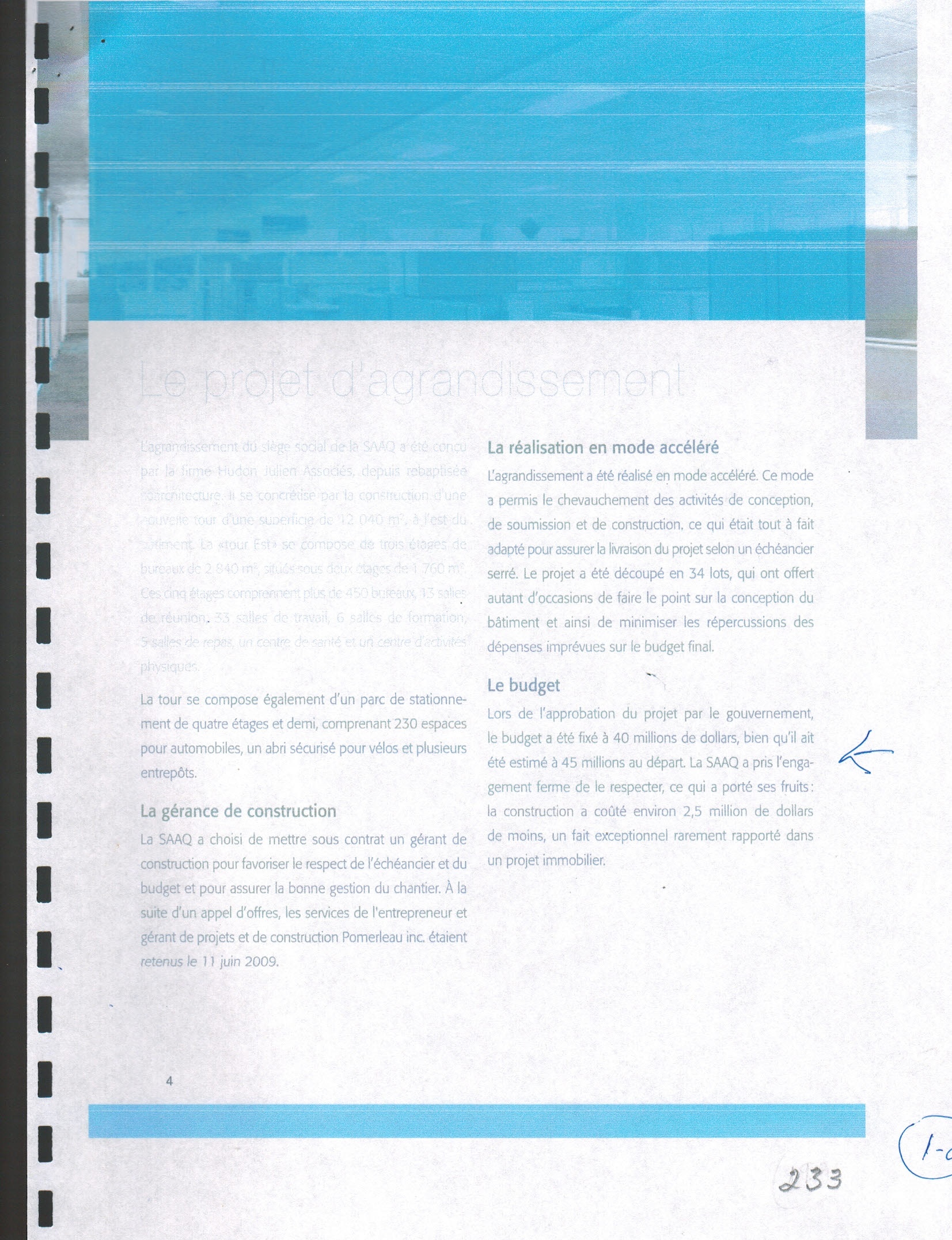 Le budget Lors de l'approbation du projet par le gouvernement, le budget a été fixé à 40 millions de dollars, bien qu'il ait été estimé à 45 millions au départ. La SAAQ a pris l'enga-gement ferme de le respecter, ce qui a porté ses fruits la construction a coûté environ 2,5 million de dollars de moins, un fait exceptionnel rarement rapporté dans un projet immobilier.
