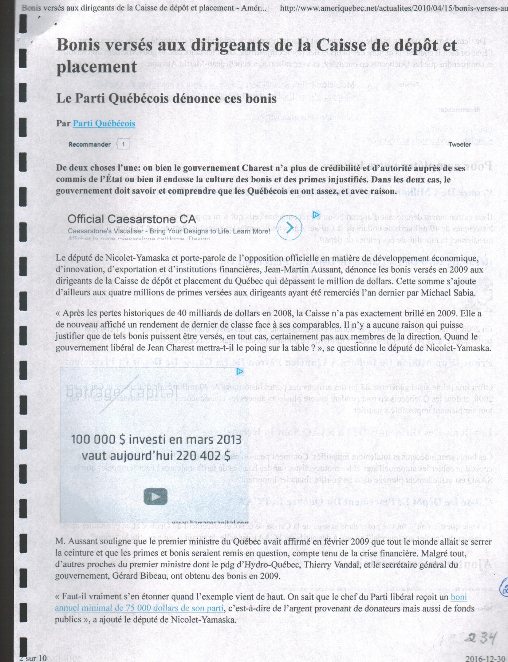 Le député de Nicolet-Yamaska et porte-parole de l'opposition officielle en matière de développement économique, d'innovation, d'exportation et d'institutions financières, Jean-Martin Aussant, dénonce les bonis versés en 2009 aux dirigeants de la Caisse de dépôt et placement du Québec qui dépassent le million de dollars. Cette somme s'ajoute d'ailleurs aux quatre millions de primes versées aux dirigeants ayant été remerciés l'an dernier par Michael Sabia.