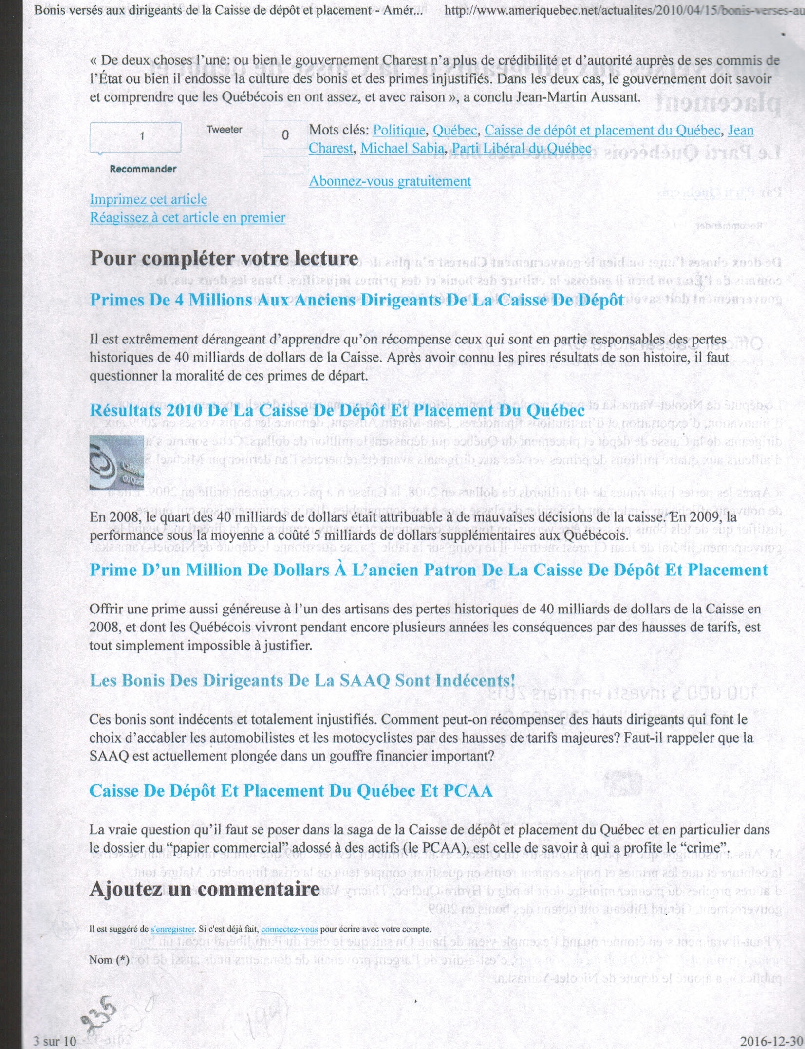« Après les pertes historiques de 40 milliards de dollars en 2008, la Caisse n'a pas exactement brillé en 2009. Elle a de nouveau affiché un rendement de dernier de classe face à ses comparables. Il n'y a aucune raison qui puisse justifier que dè tels bonis puissent être versés, en tout cas, certainement pas aux membres de la direction. Quand le gouvernement libéral de Jean Charest mettra-t-il le poing sur la table ? », se questionne le député de Nicolet-Yamaska.