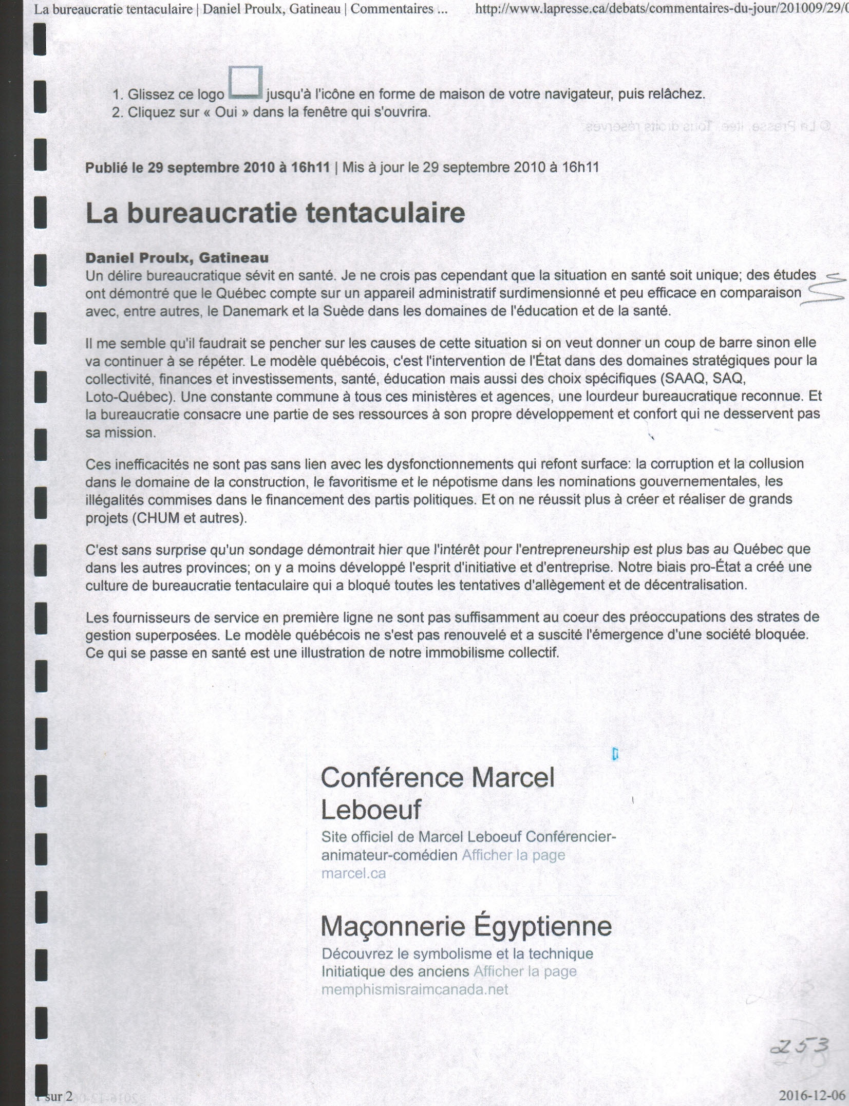 Un délire bureaucratique sévit en santé. Je ne crois pas cependant que la situation en santé soit unique; des études ont démontré que le Québec compte sur un appareil administratif surdimensionné et peu efficace en comparaison avec, entre autres. le Danemark et la Suède dans les domaines de l'éducation et de la santé.