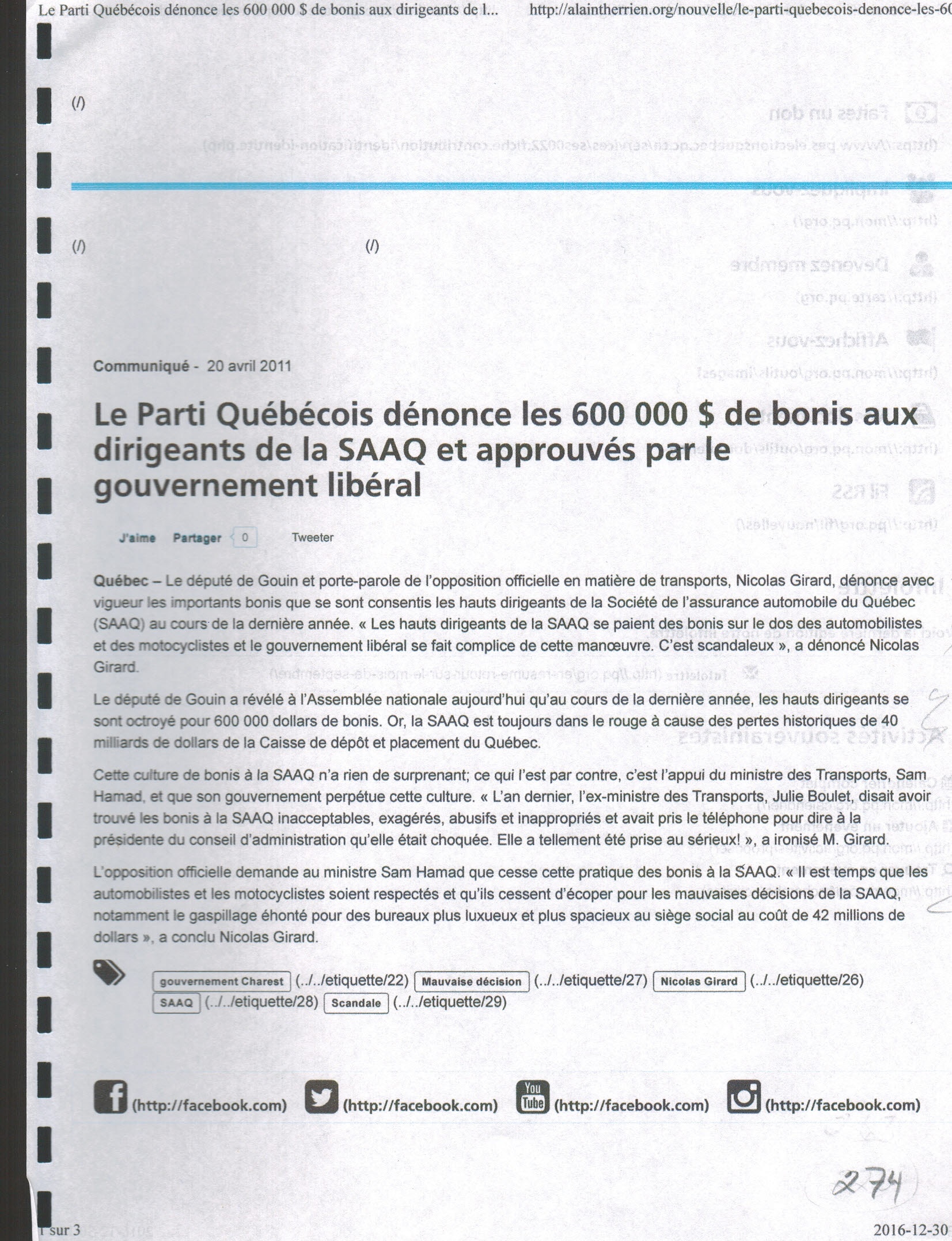 Québec — Le député de Gouin et porte-parole de l'opposition officielle en matière de transports, Nicolas Girard, dénonce avec vigueur les importants bonis que se sont consentis les hauts dirigeants de la Société de l'assurance automobile du Québec (SAAQ) au cours-de la dernière année. « Les hauts dirigeants de la SAAQ se paient des bonis sur le dos des automobilistes et des motocyclistes et le gouvernement libéral se fait complice de cette manoeuvre. C'est scandaleux », a dénoncé Nicolas Girard.