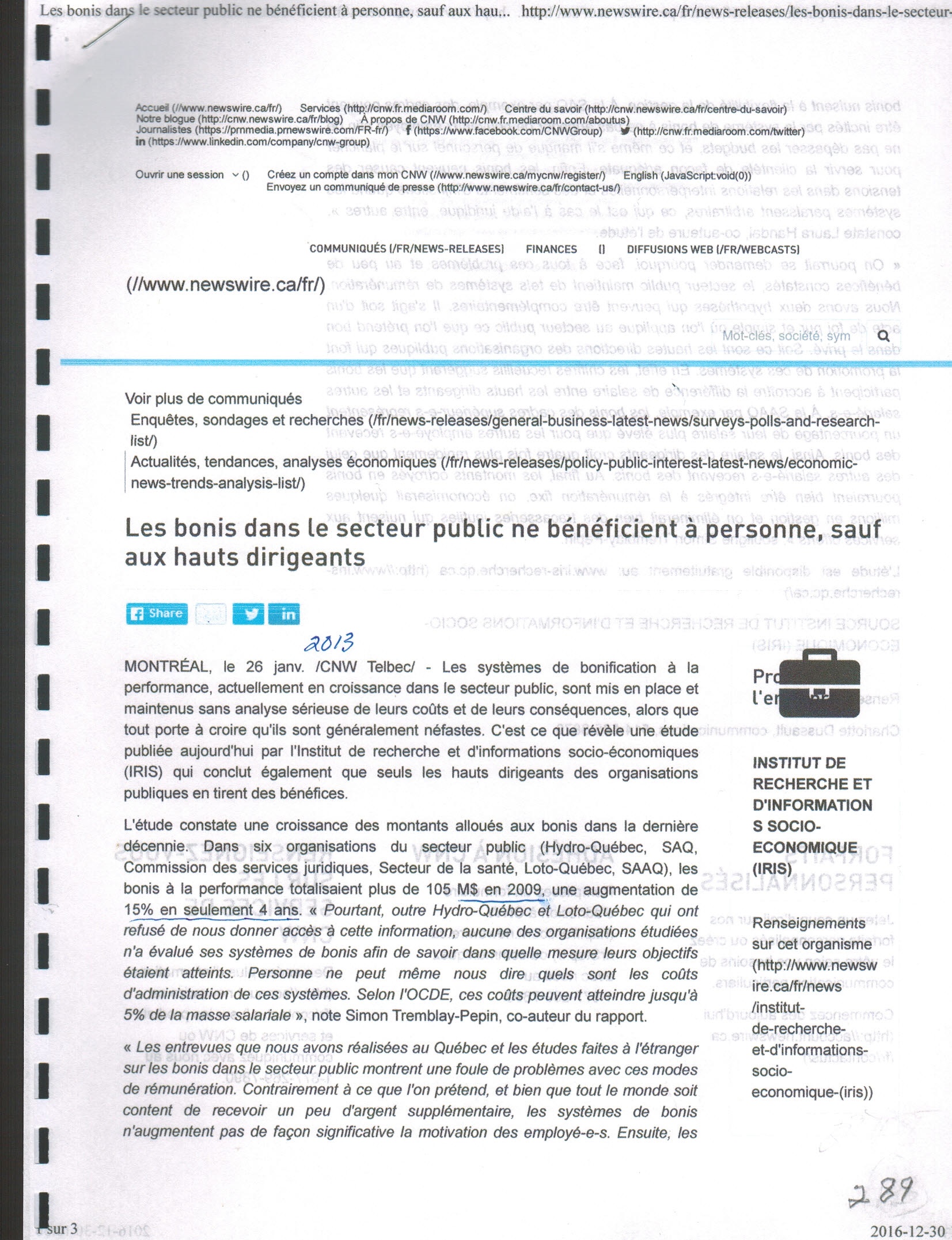 MONTRÉAL, le 26 janv. /CNW Telbec/ - Les systèmes de bonification à la performance, actuellement en croissance dans le secteur public, sont mis en place et maintenus sans analyse sérieuse de leurs coûts et de leurs conséquences, alors que tout porte à croire qu'ils sont généralement néfastes. C'est ce que révèle une étude publiée aujourd'hui par l'Institut de recherche et d'informations socio-économiques (IRIS) qui conclut également que seuls les hauts dirigeants des organisations publiques en tirent des bénéfices.