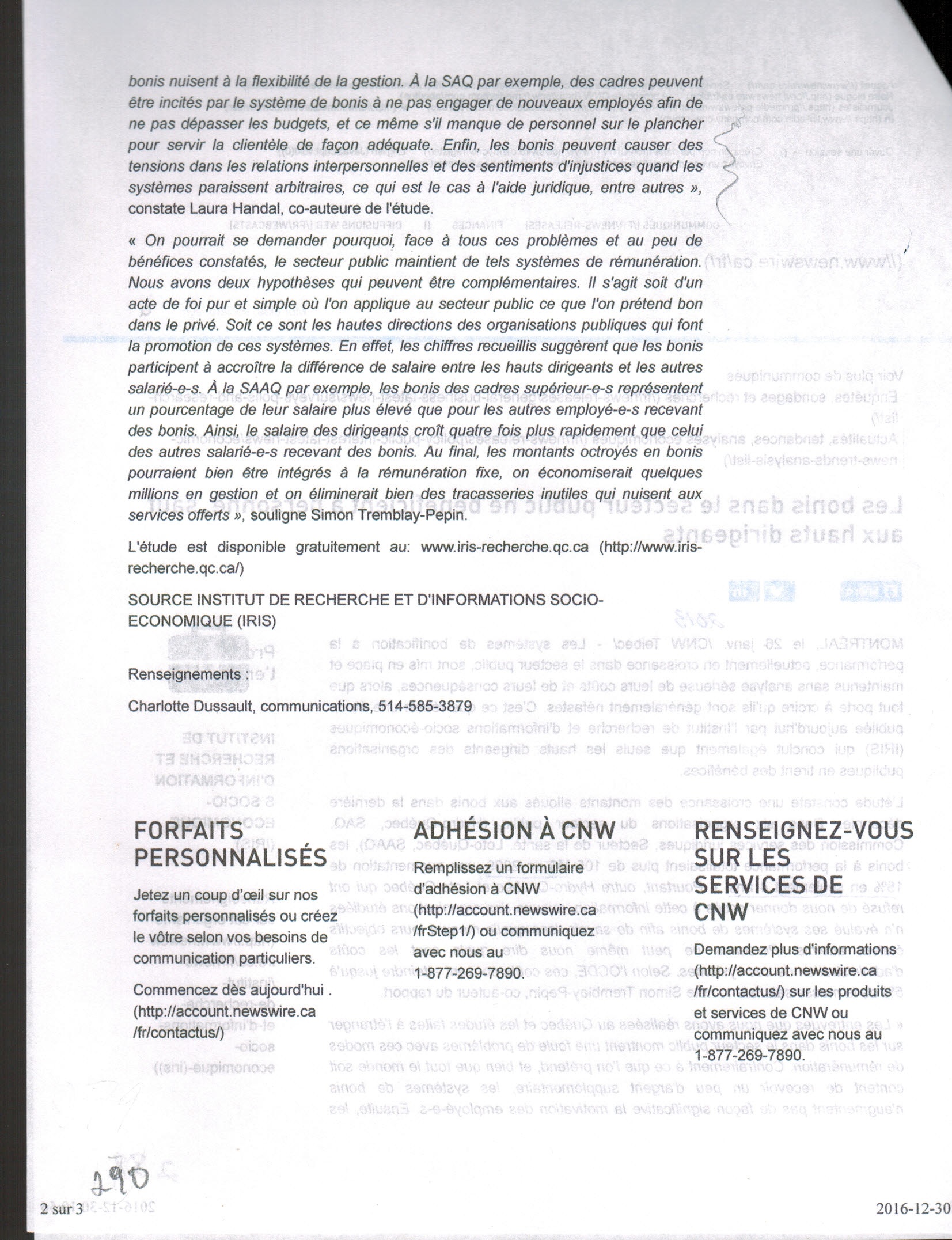 « On pourrait se demander pourquoi, face à tous ces problèmes et au peu de bénéfices constatés, le secteur public maintient de tels systèmes de rémunération. Nous avons deux hypothèses qui peuvent être complémentaires. Il s'agit soit d'un acte de foi pur et simple où l'on applique au secteur public ce que l'on prétend bon dans le privé. Soit ce sont les hautes directions des organisations publiques qui font la promotion de ces systèmes. En effet, les chiffres recueillis suggèrent que les bonis participent à accroître la différence de salaire entre les hauts dirigeants et les autres salarié-e-s. À la SAAQ par exemple, les bonis des cadres supérieur-e-s représentent un pourcentage de leur salaire plus élevé que pour les autres employé-e-s recevant des bonis. Ainsi, le salaire des dirigeants croît quatre fois plus rapidement que celui des autres salarié-e-s recevant des bonis. Au final, les montants octroyés en bonis pourraient bien être intégrés à la rémunération fixe, on économiserait quelques millions en gestion et on éliminerait bien des tracasseries inutiles qui nuisent aux services offerts », souligne Simon Tremblay-Pepin.