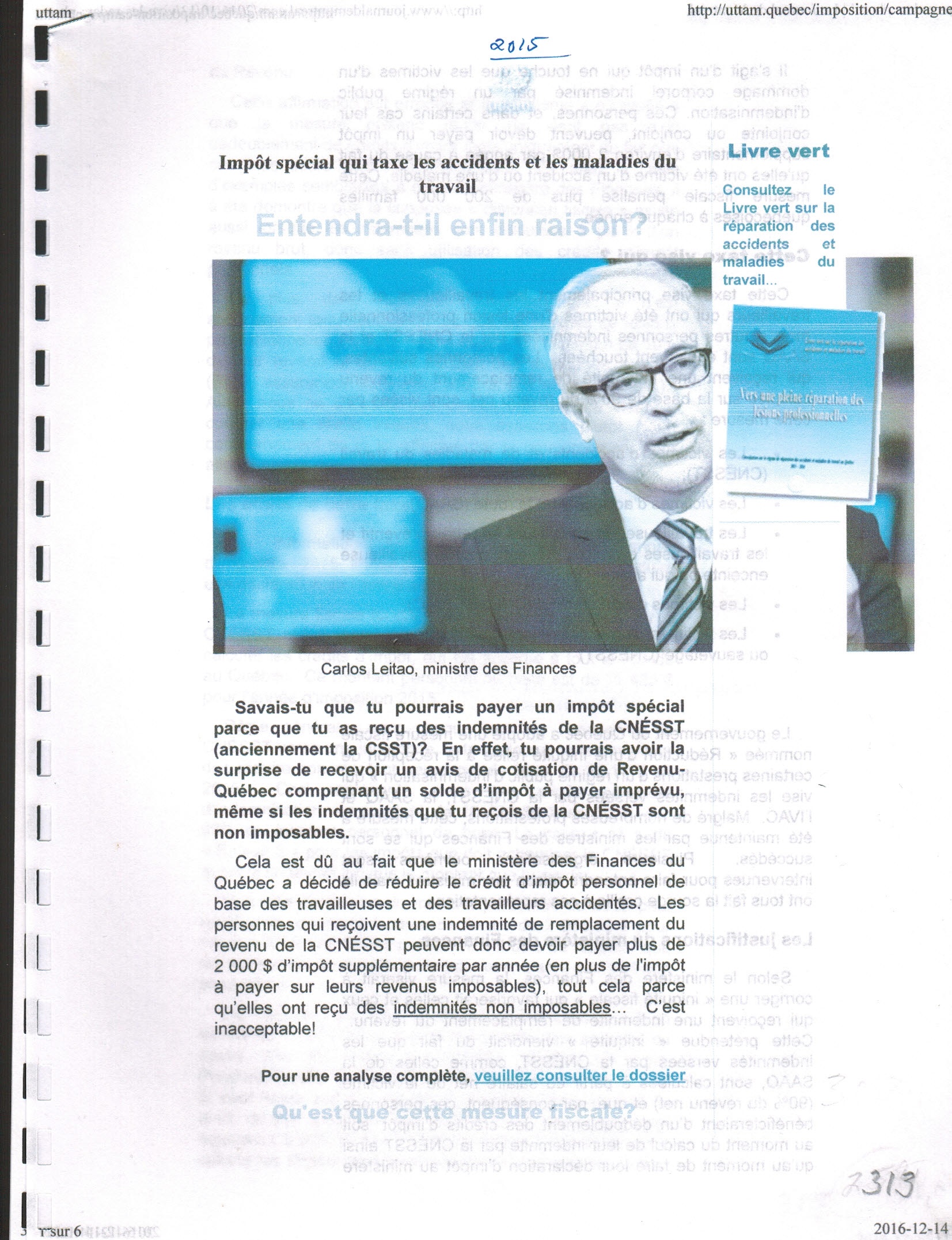Le gouvernement du Québec a adopté une mesure fiscale nommée « Réduction d'une iniquité reliée à la réception de certaines prestations d'un régime public d'indemnisation » qui vise les indemnités versées par la CNÉSST, la SAAQ et l'IVAC. Malgré de nombreuses protestations, cette mesure a été maintenue par les ministres des Finances qui se sont succédés. Plusieurs organisations ouvrières sont intervenues pour faire entendre raison aux ministres mais ils ont tous fait la sourde oreille à ces représentations.
