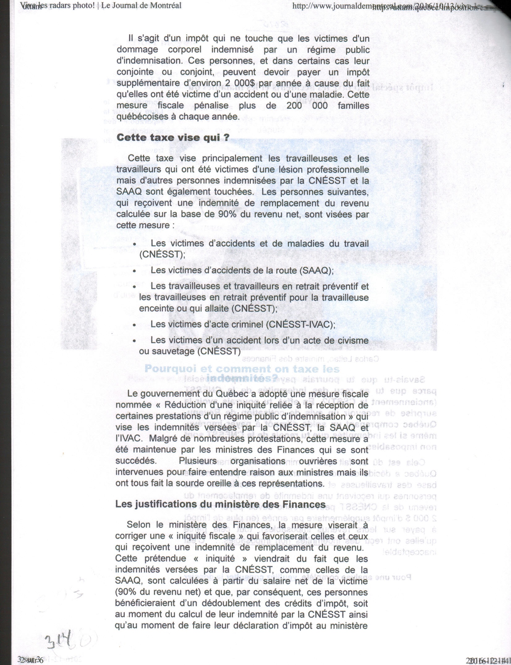 s'agit d'un impôt qui ne touche que les victimes d'un dommage corporel indemnisé par un régime public d'indemnisation. Ces personnes, et dans certains cas leur conjointe ou conjoint, peuvent devoir payer un impôt supplémentaire d'environ 2 000$ par année à cause du fait qu'elles ont été victime d'un accident ou d'une maladie. Cette mesure fiscale pénalise plus de 200 000 familles québécoises à chaque année.