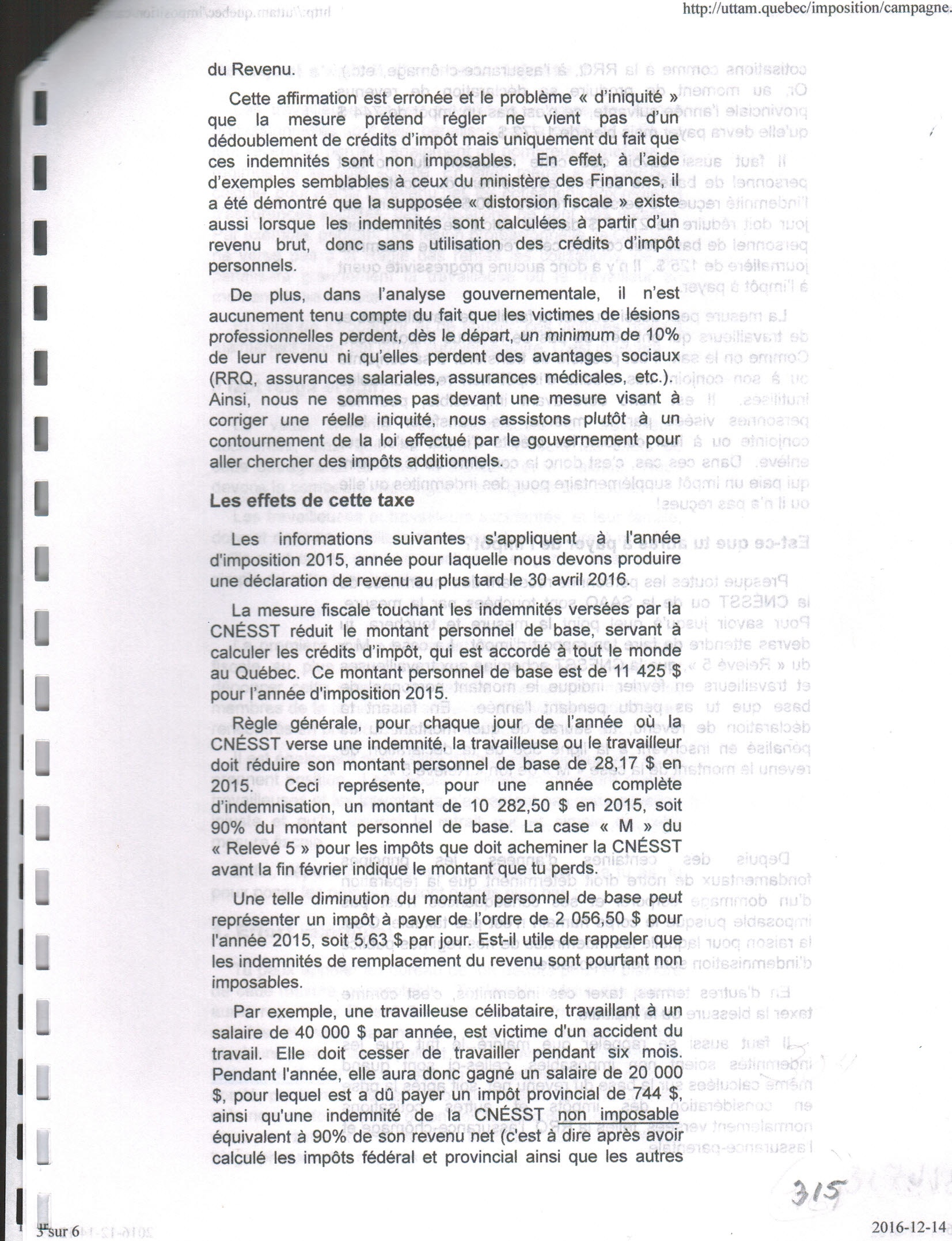 Une telle diminution du montant personnel de base peut représenter un impôt à payer de l'ordre de 2 056,50 $ pour l'année 2015, soit 5,63 $ par jour. Est-il utile de rappeler que les indemnités de remplacement du revenu sont pourtant non imposables.