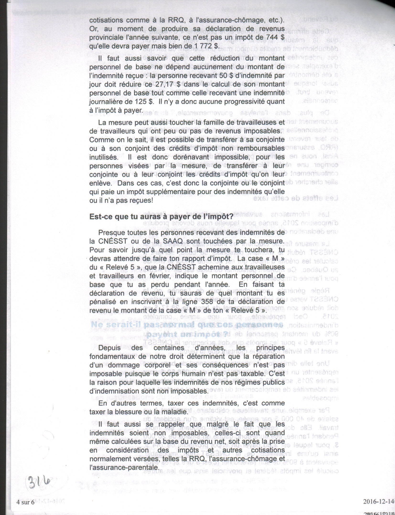 Savais-tu que tu pourrais payer un impôt spécial parce que tu as reçu des indemnités de la CNÉSST (anciennement la CSST)? En effet, tu pourrais avoir la surprise de recevoir un avis de cotisation de Revenu-Québec comprenant un solde d'impôt à payer imprévu, même si les indemnités que tu reçois de la CNÉSST sont non imposables. Cela est dû au fait que le ministère des Finances du Québec a décidé de réduire le crédit d'impôt personnel de base des travailleuses et des travailleurs accidentés. Les personnes qui reçoivent une indemnité de remplacement du revenu de la CNÉSST peuvent donc devoir payer plus de 2 000 $ d'impôt supplémentaire par année (en plus de l'impôt à payer sur leurs revenus imposables), tout cela parce qu'elles ont reçu des indemnités non imposables... C'est inacceptable!
