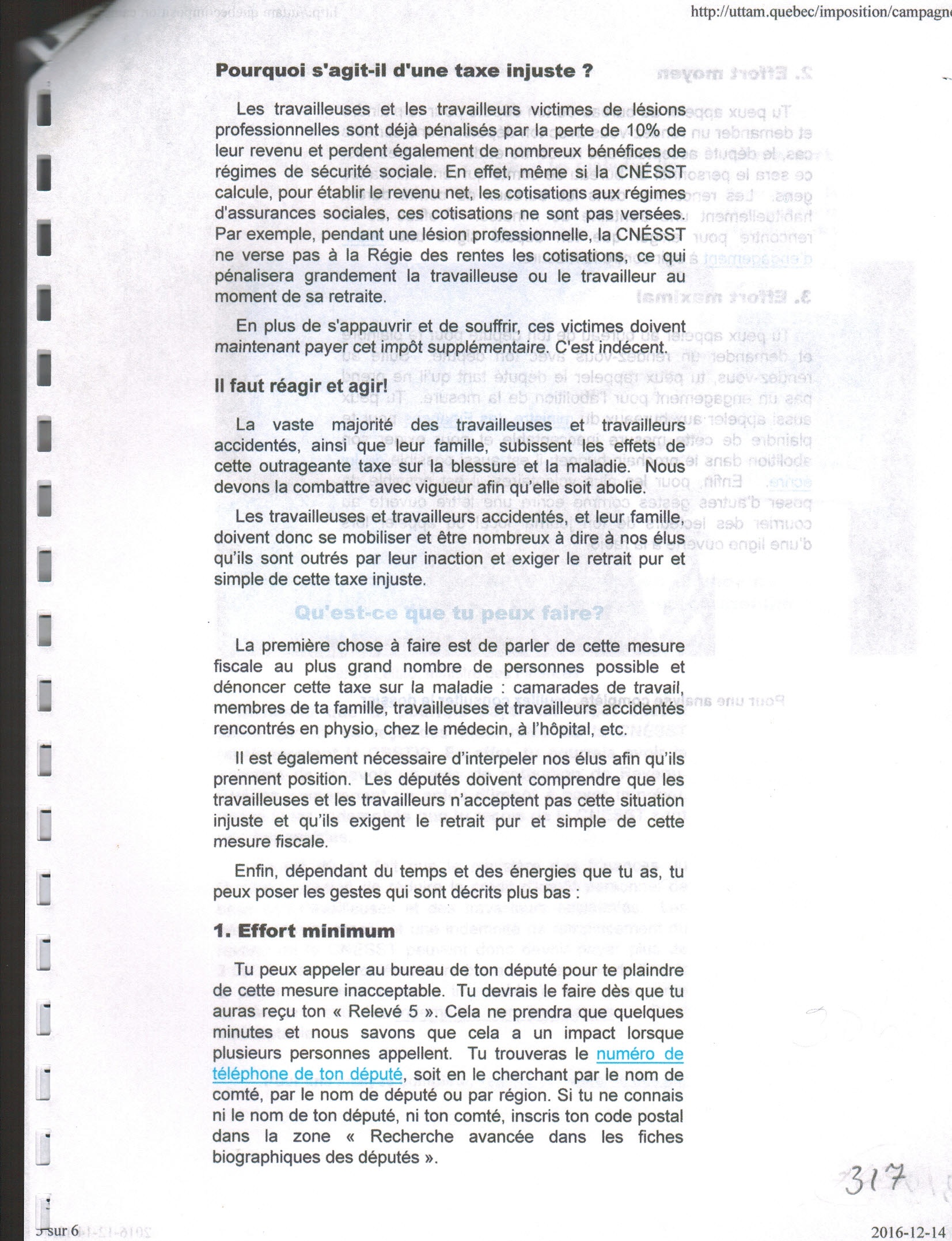 La vaste majorité des travailleuses et travailleurs accidentés, ainsi que leur famille, subissent les effets de cette outrageante taxe sur la blessure et la maladie. Nous devons la combattre avec vigueur afin qu'elle soit abolie. Les travailleuses et travailleurs accidentés, et leur famille, doivent donc se mobiliser et être nombreux à dire à nos élus qu'ils sont outrés par leur inaction et exiger le retrait pur et simple de cette taxe injuste.