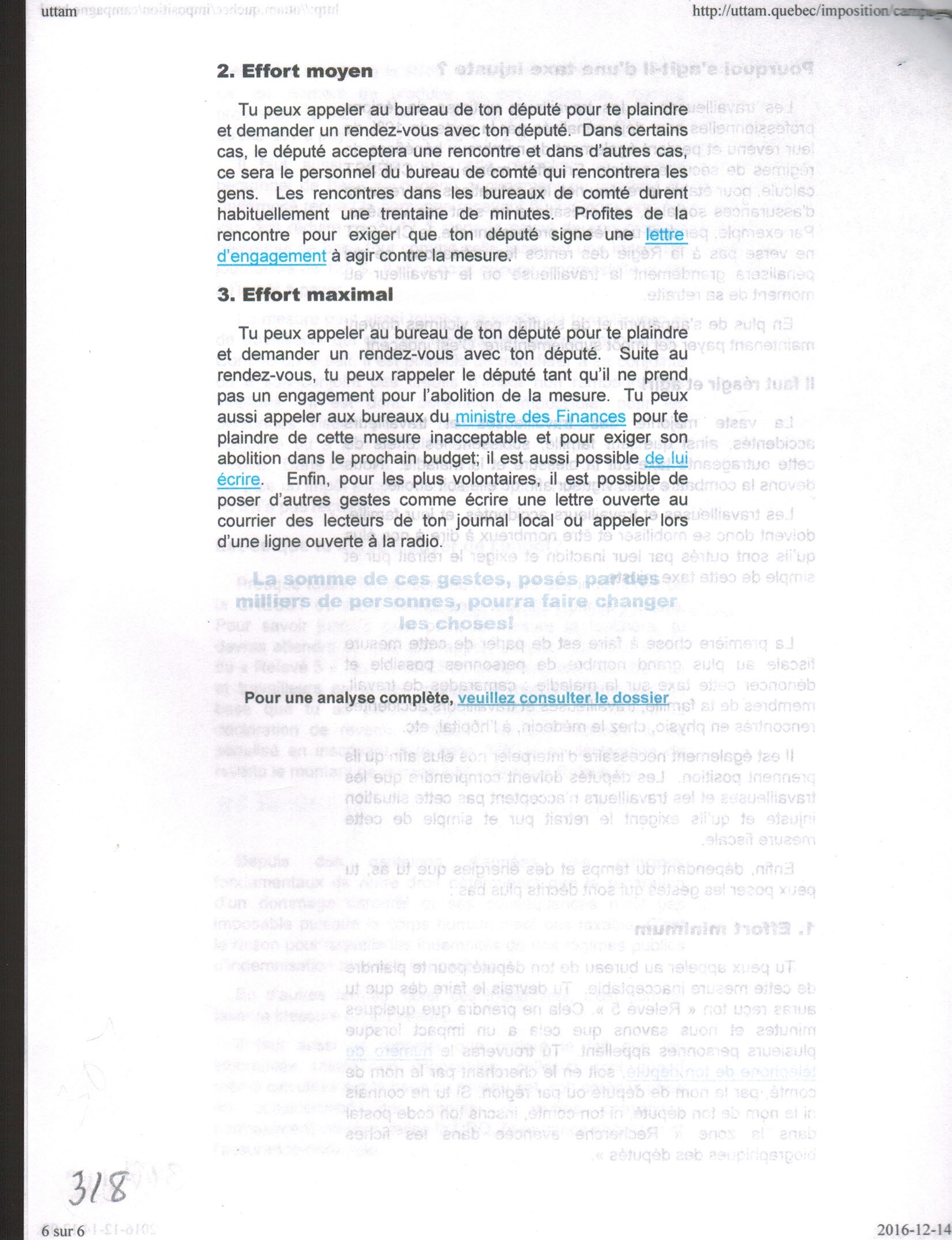 Tu peux appeler au bureau de ton député pour te plaindre et demander un rendez-vous avec ton député. Suite au rendez-vous, tu peux rappeler le député tant qu'il ne prend pas un engagement pour l'abolition de la mesure. Tu peux aussi appeler aux bureaux du ministre des Finances pour te plaindre de cette mesure inacceptable et pour exiger son abolition dans le prochain budget; il est aussi possible !- écrire. Enfin, pour les plus volontaires, il est possible de poser d'autres gestes comme écrire une lettre ouverte au courrier des lecteurs de ton journal local ou appeler lors d'une ligne ouverte à la radio.