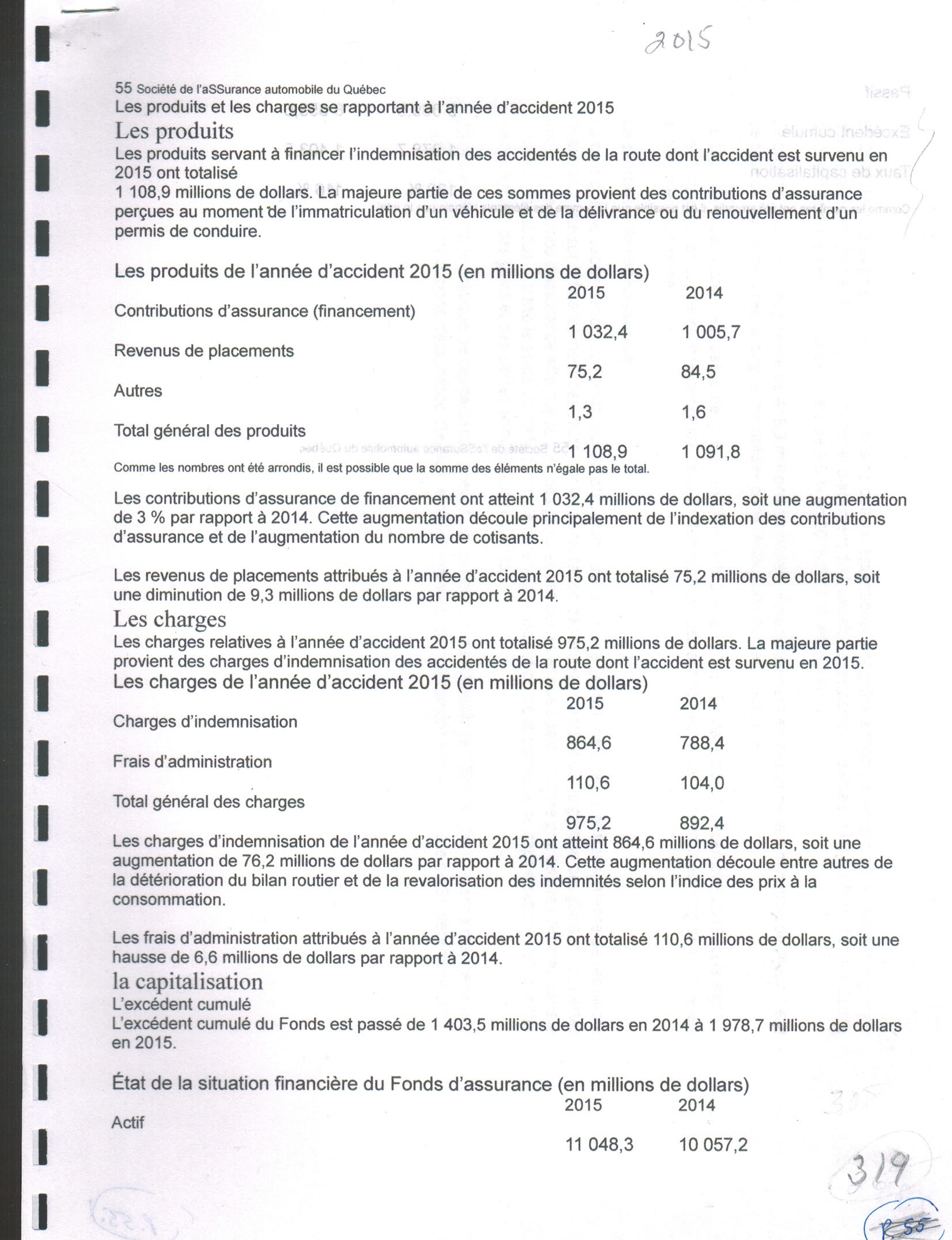 les produits servant a financer l'indemnisation des accidentés de la route dont l'accident est survenu en 2015 ont totalisé $1,108,9 millions